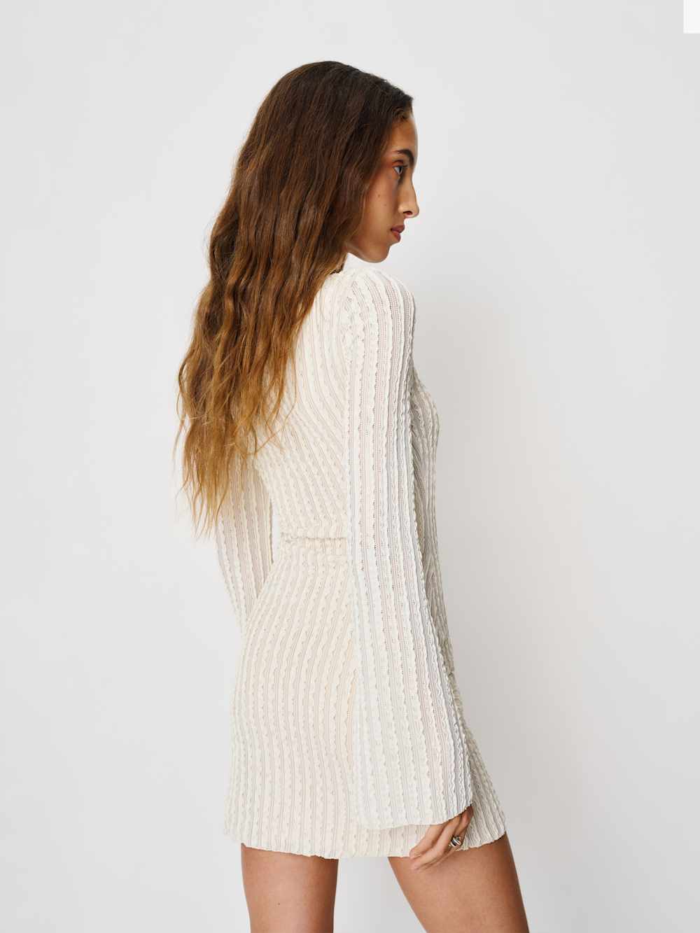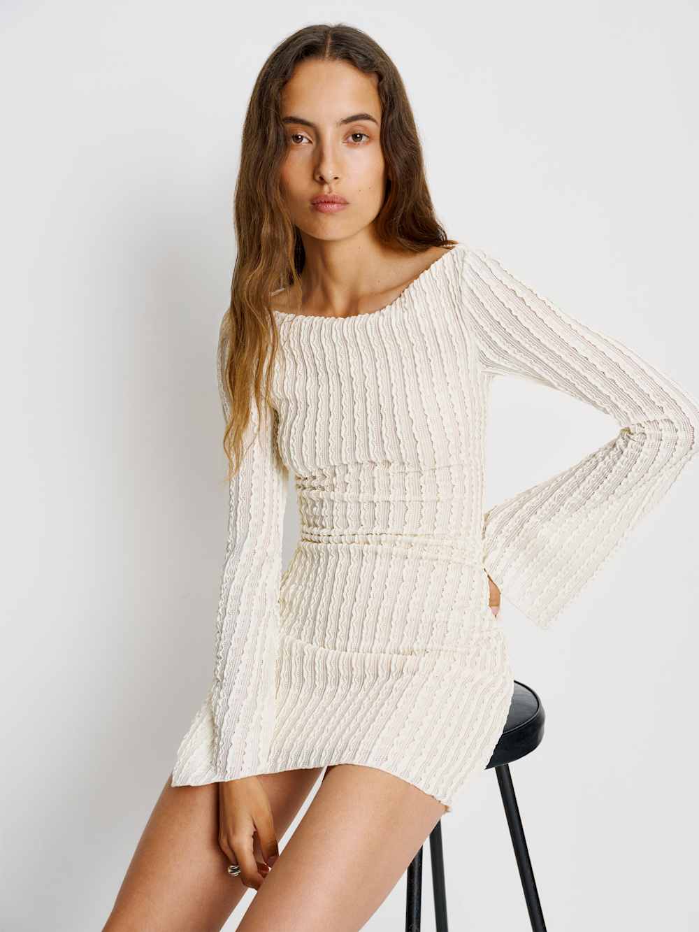 You make it look easy. Shop the Ezra Knit Dress from Reformation, a long-sleeved mini dress with a crew neckline and bell sleeves.