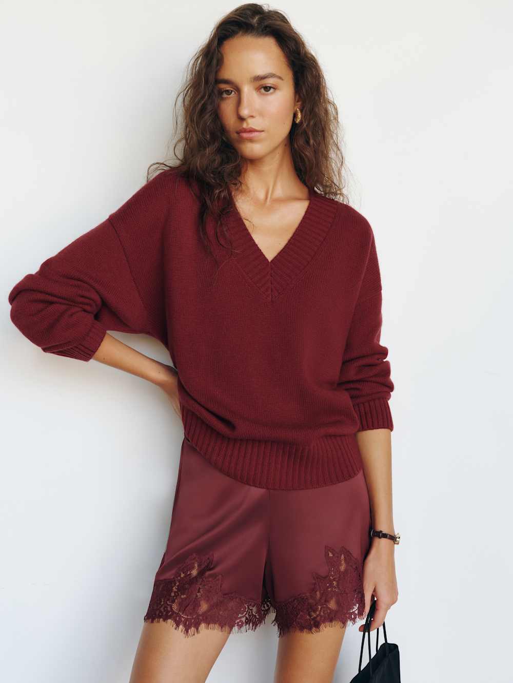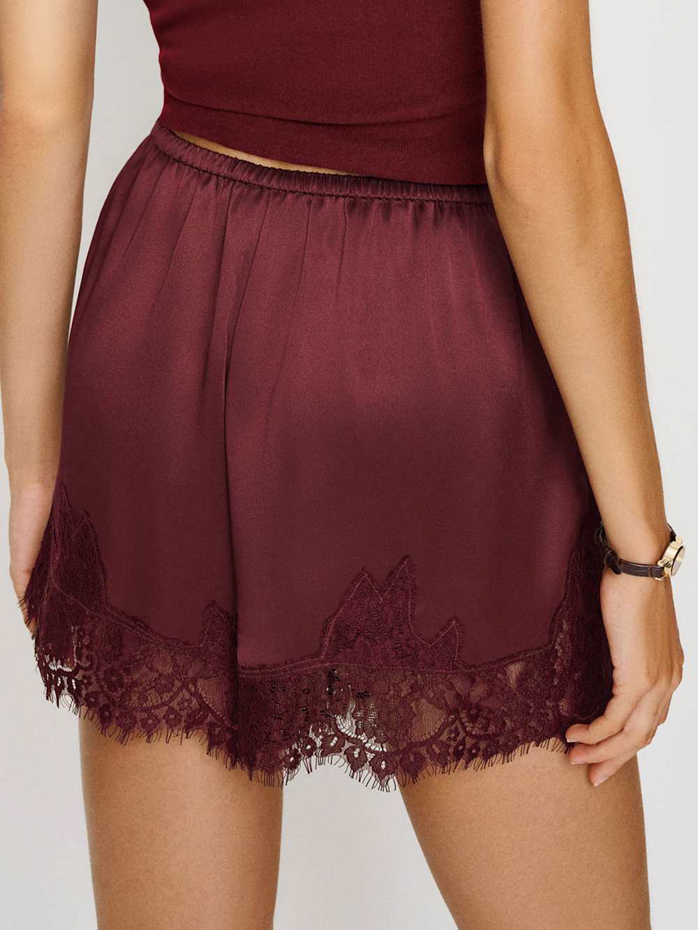 May cause compliments. Shop the Fern Satin Short from Reformation, a mid-rise short with a relaxed fit and a lace hem.
