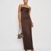 Slinky. Shop the Frankie Dress from Reformation, a slim-fitting midi dress with a straight neckline, non-adjustable spaghetti straps, and a center back slit.