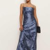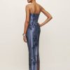 Slinky. Shop the Frankie Silk Dress from Reformation, a slim fitting dress with a straight neckline, non-adjustable spaghetti straps and a center back slit.