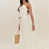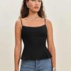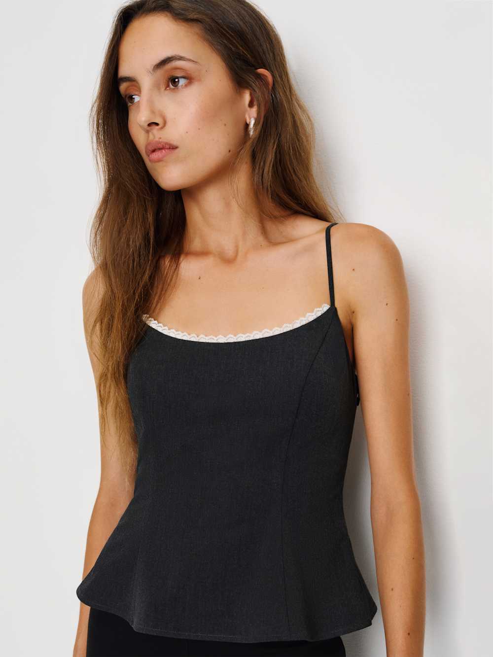 Up top. Shop the Genevieve Top from Reformation, a sleeveless top with a curved neckline, lace trim at the bust, and a peplum hem.