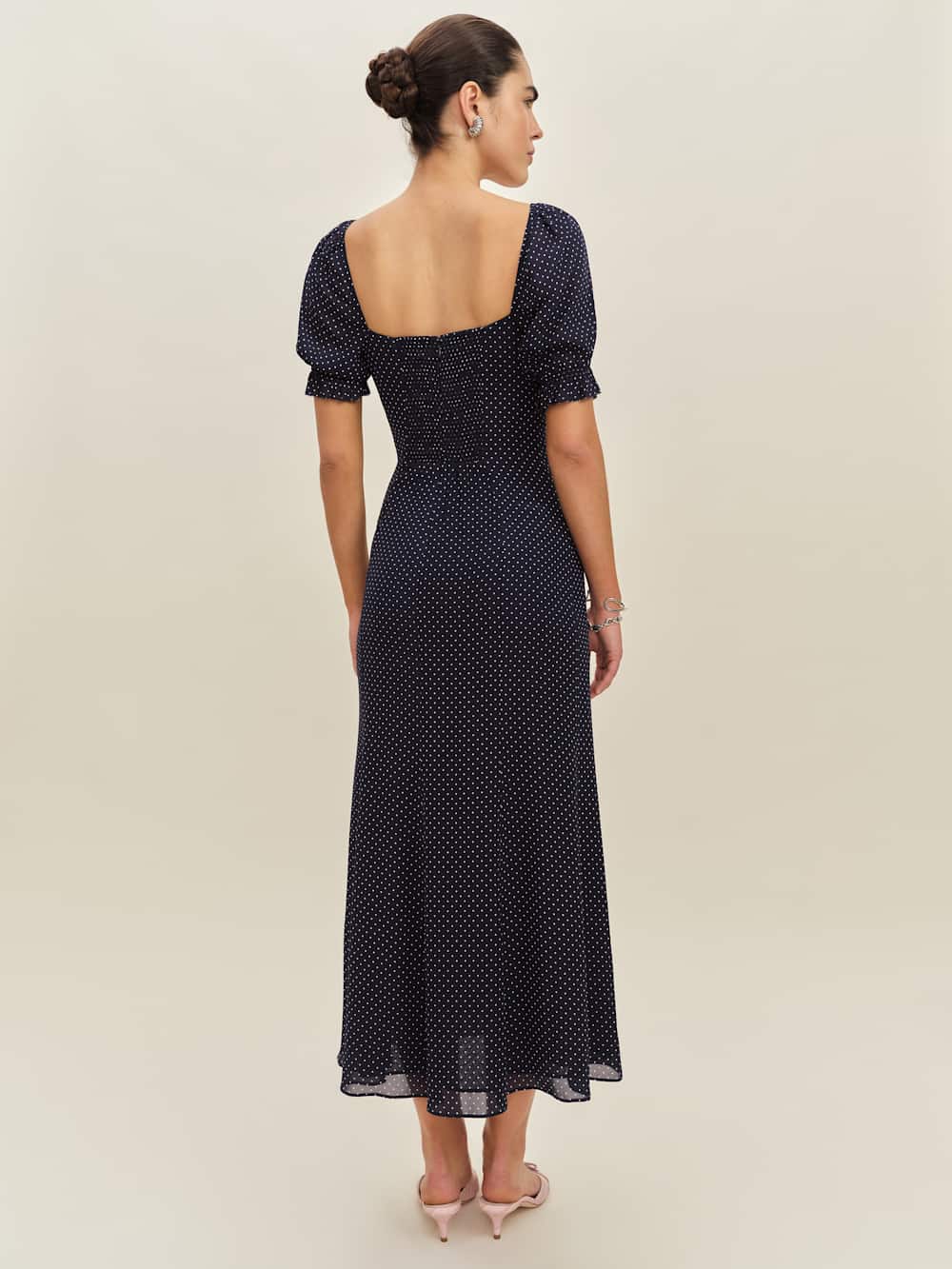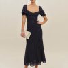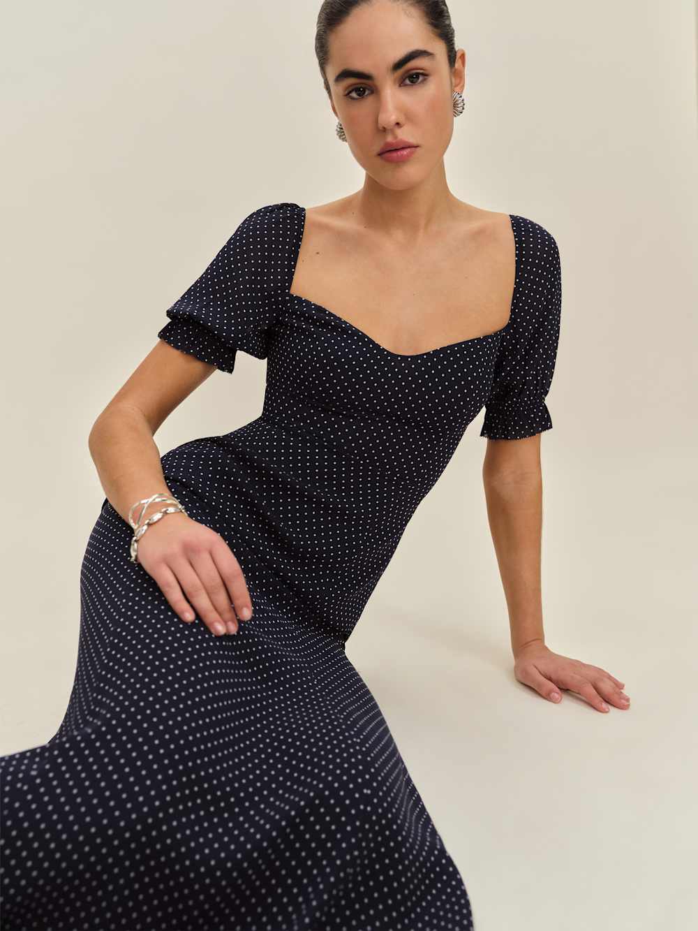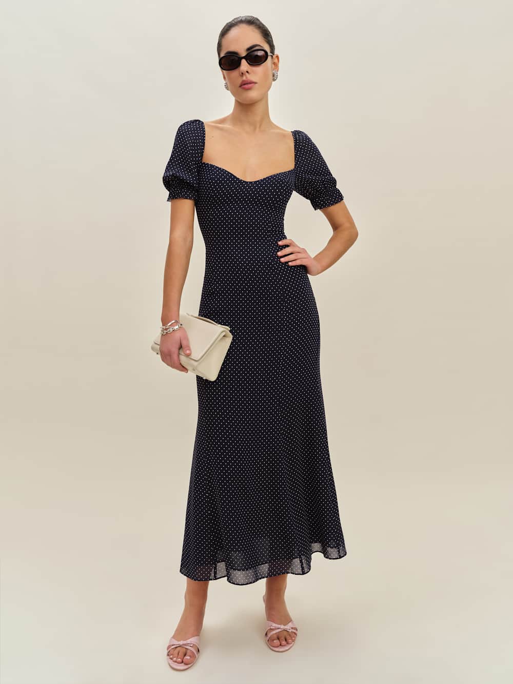 How classic. Shop the Gloria Dress from Reformation, a midi dress with a sweetheart neckline and short puffed sleeves.