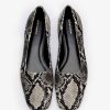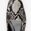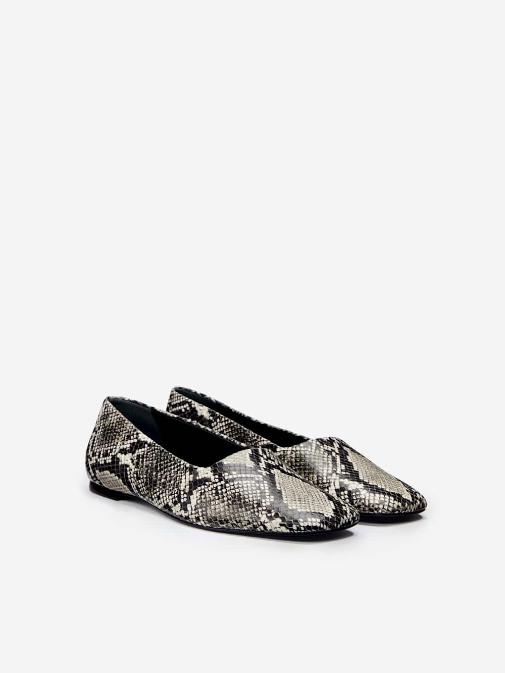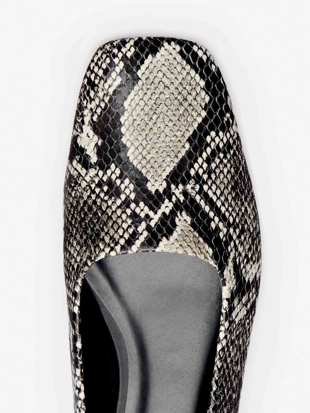 Upper is made from an embossed and printed snake pattern on cow leather. Spot clean.