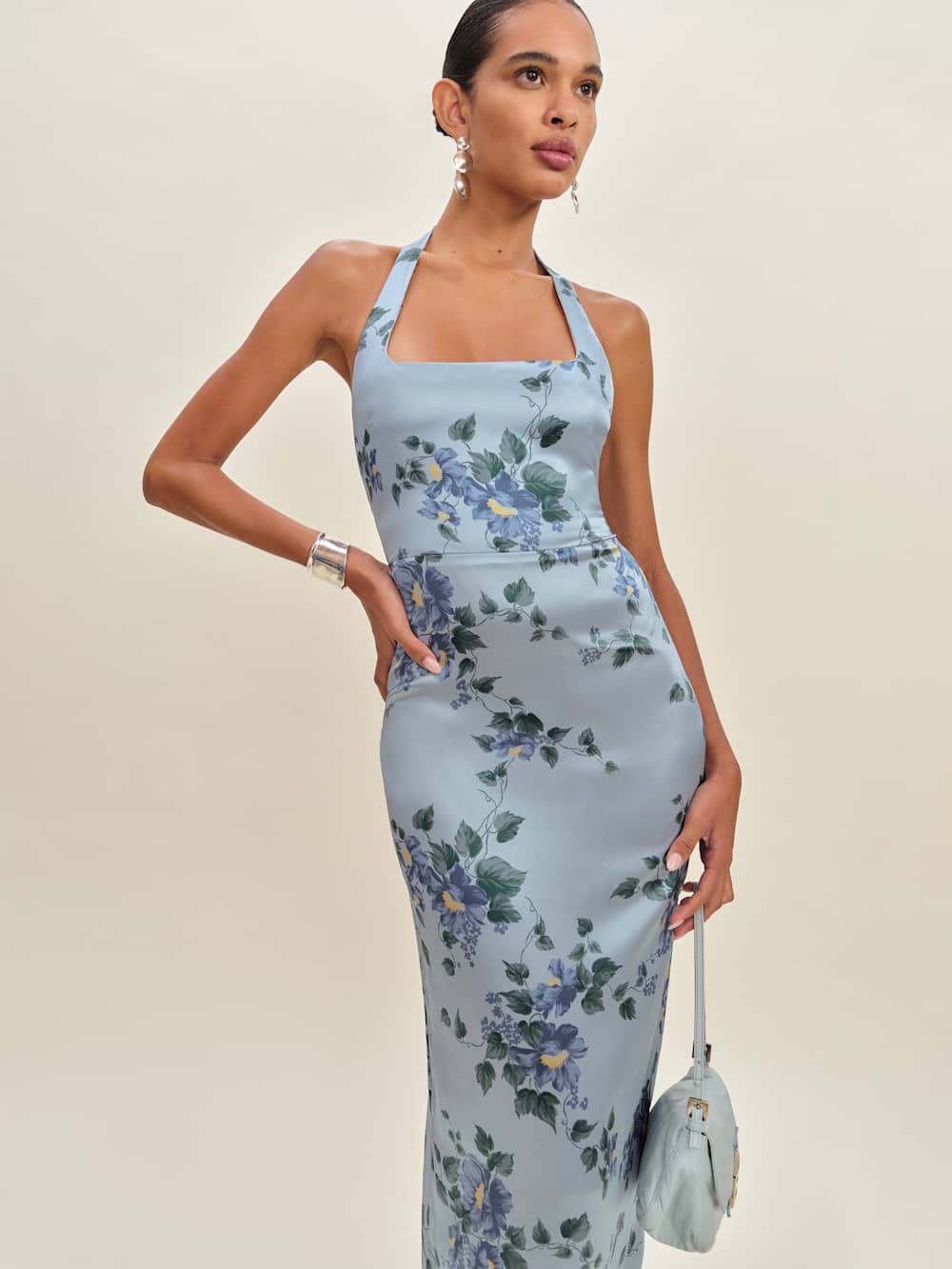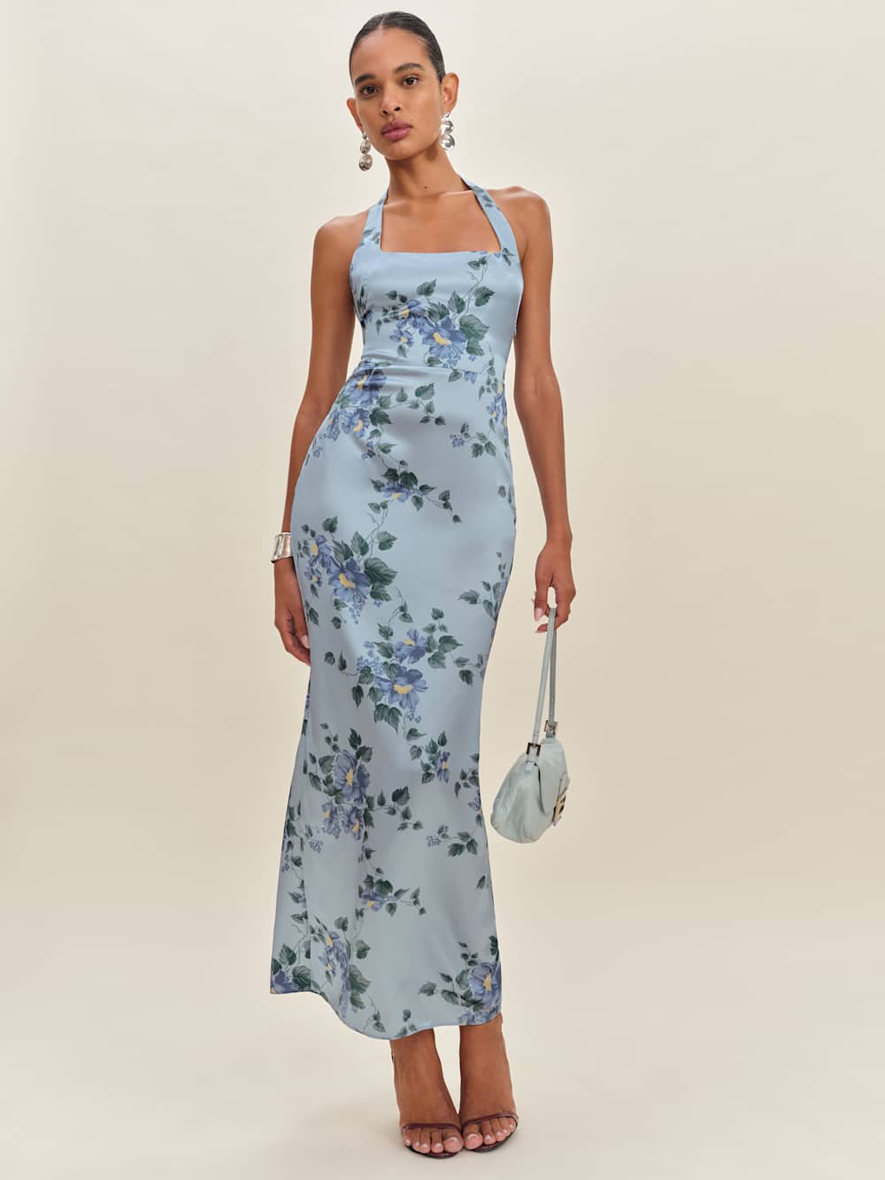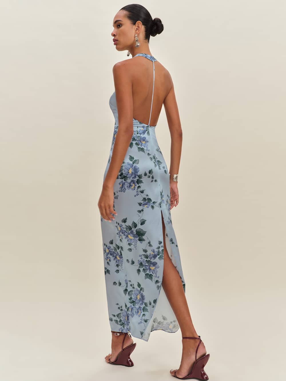 Wear the dress. Shop the Ivan Silk Dress from Reformation, a sleeveless full-length dress with a halter neckline, open back, and back slit.