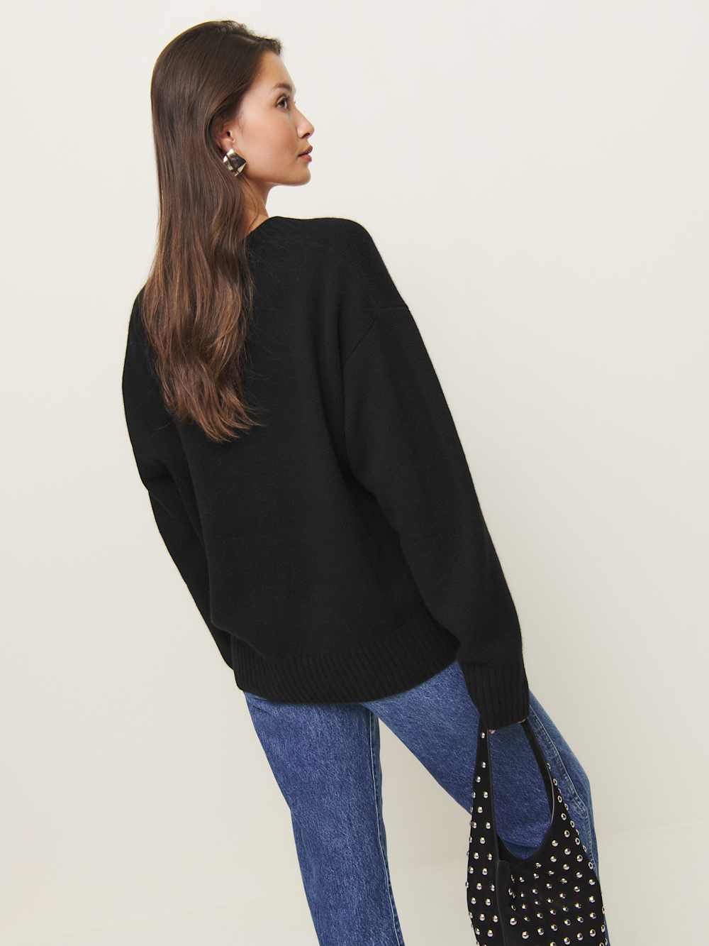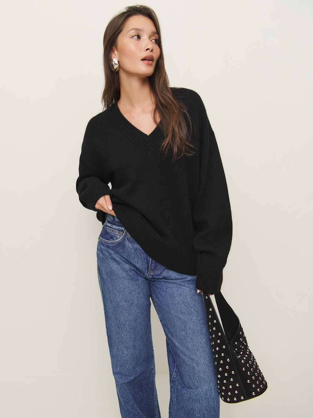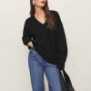 We’re just happy to know you’re cozy out there. Shop the Jadey Oversized V-neck Sweater from Reformation, a relaxed fitting sweater, with a V neckline.