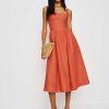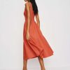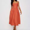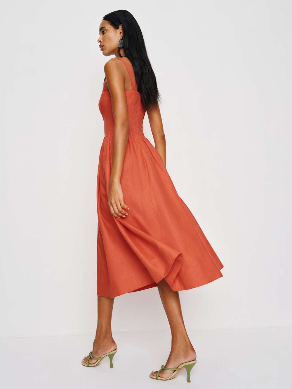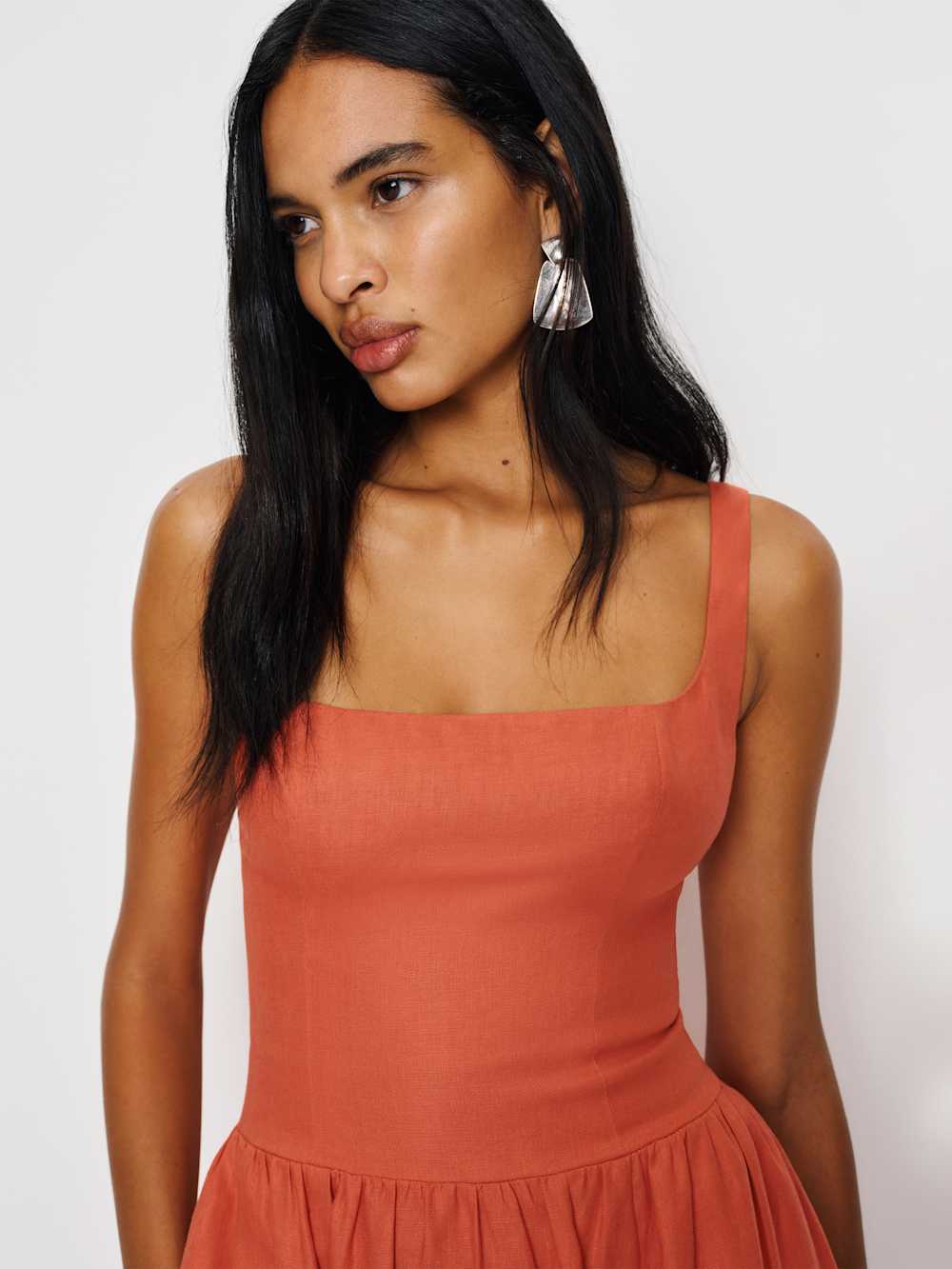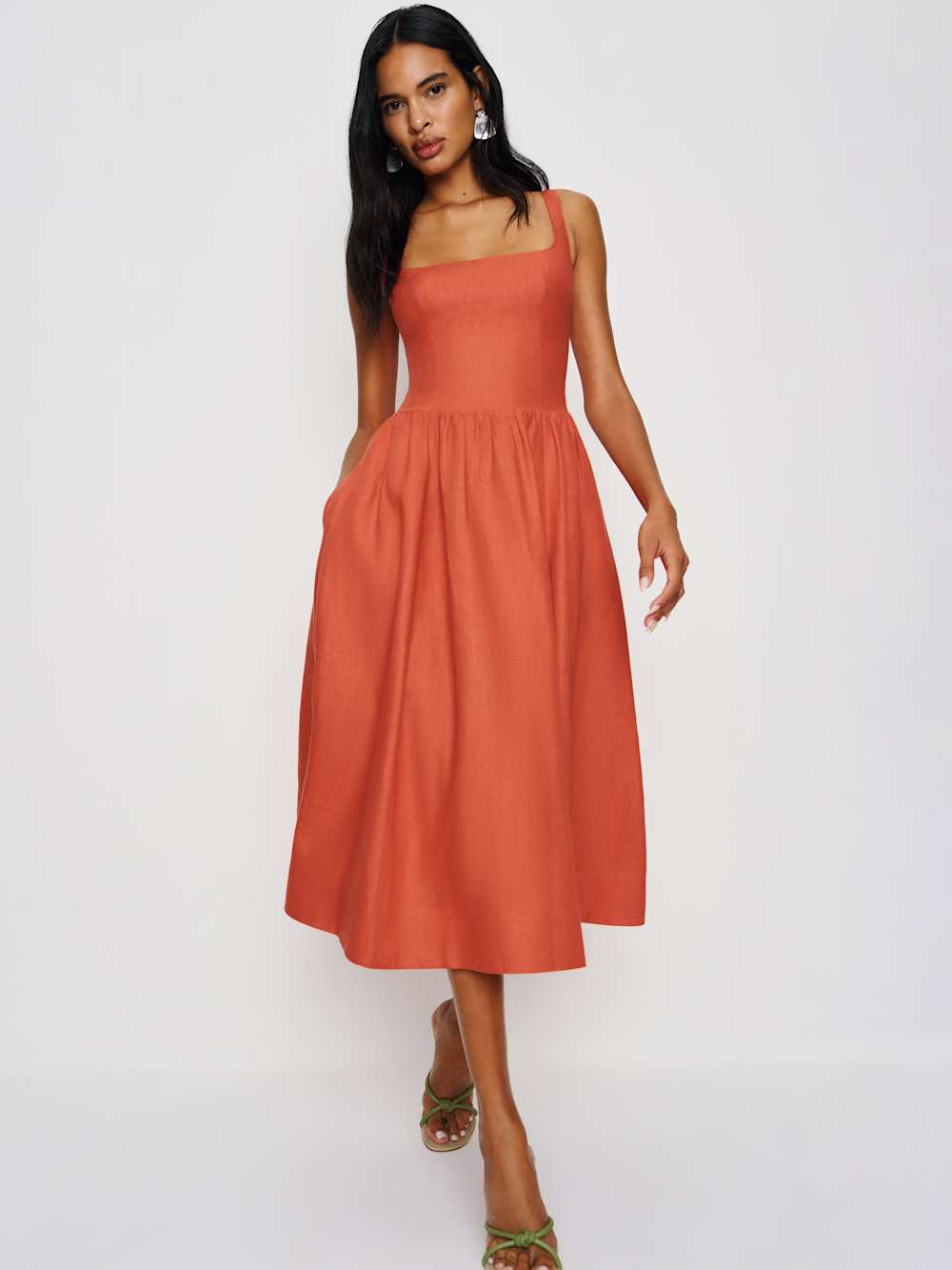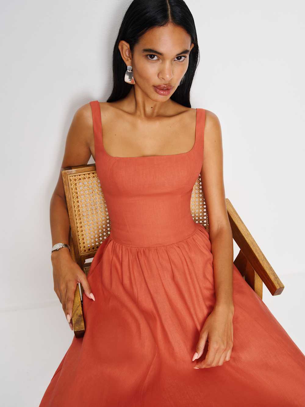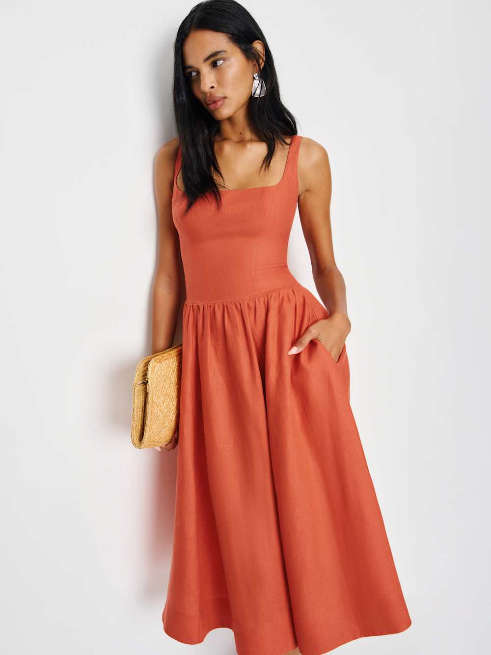 Shop the Janu Linen Dress from Reformation, a sleeveless midi dress with a square neckline, drop waist, and pleated skirt.