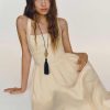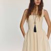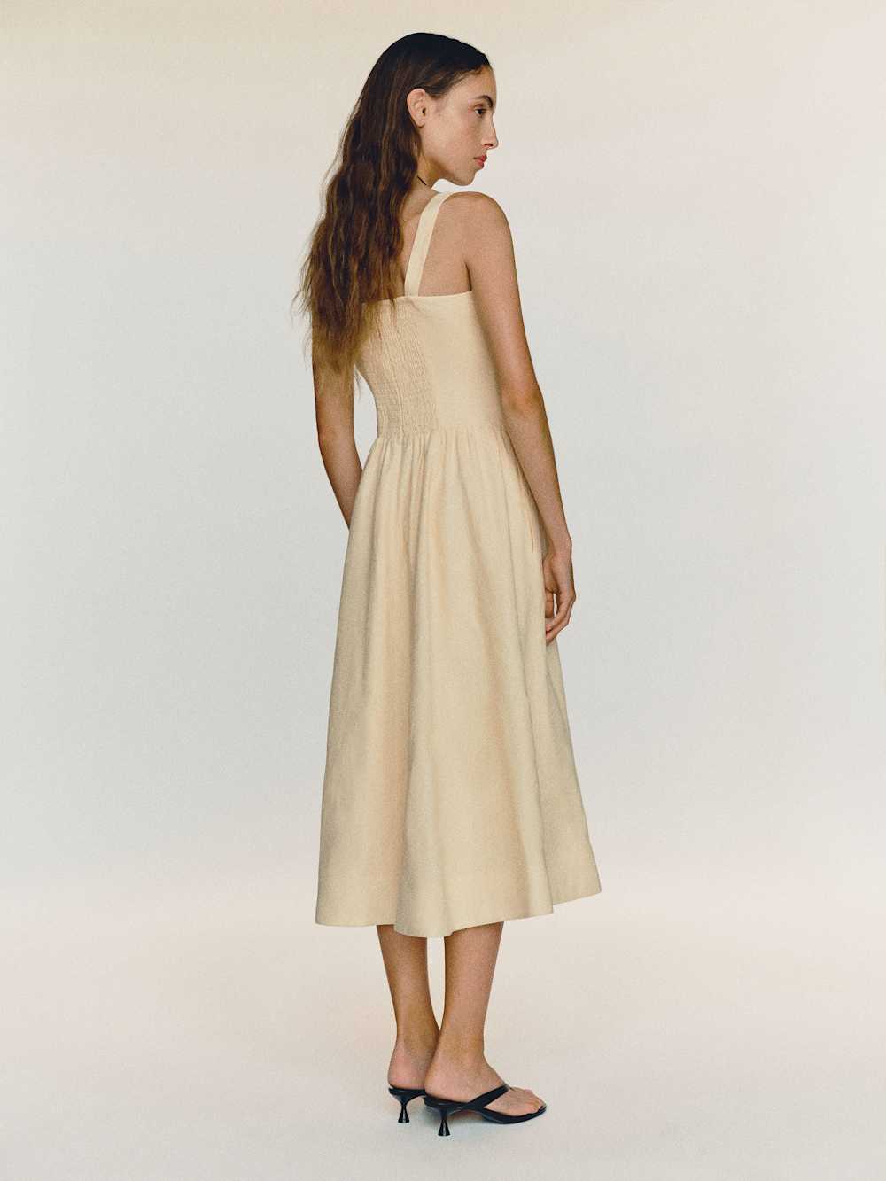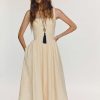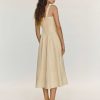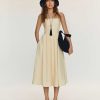 Shop the Janu Linen Dress from Reformation, a sleeveless midi dress with a square neckline, drop waist, and pleated skirt.