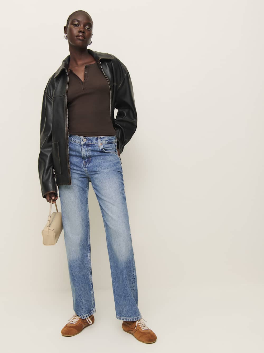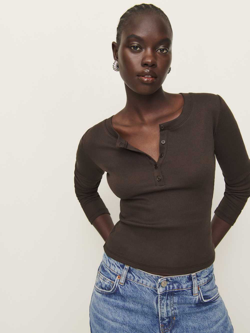 Shop the Jayden Long Sleeve Henley Tee from Reformation, a slim, fitted tee with a henley neckline.