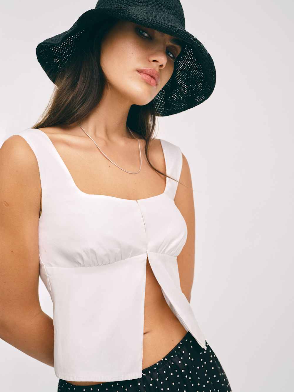 No nonsense. Shop the Jianna Top from Reformation, a sleeveless top with a scoop neck and a split hem.