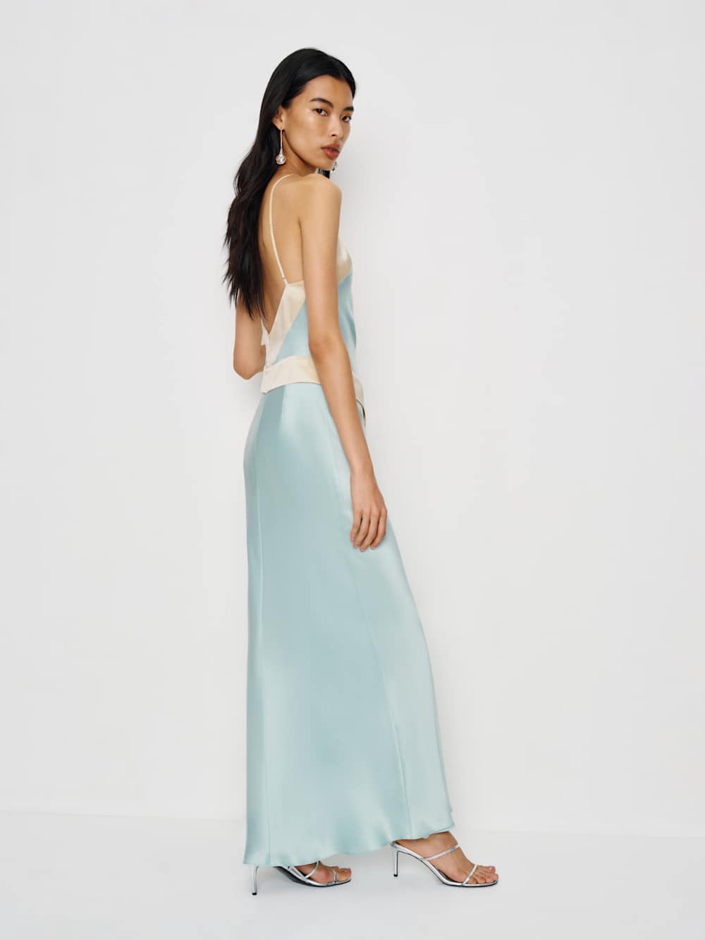 Center of attention. Shop the Jillian Silk Dress from Reformation, a sleeveless maxi dress with an adjustable halter-style neckline and open back.