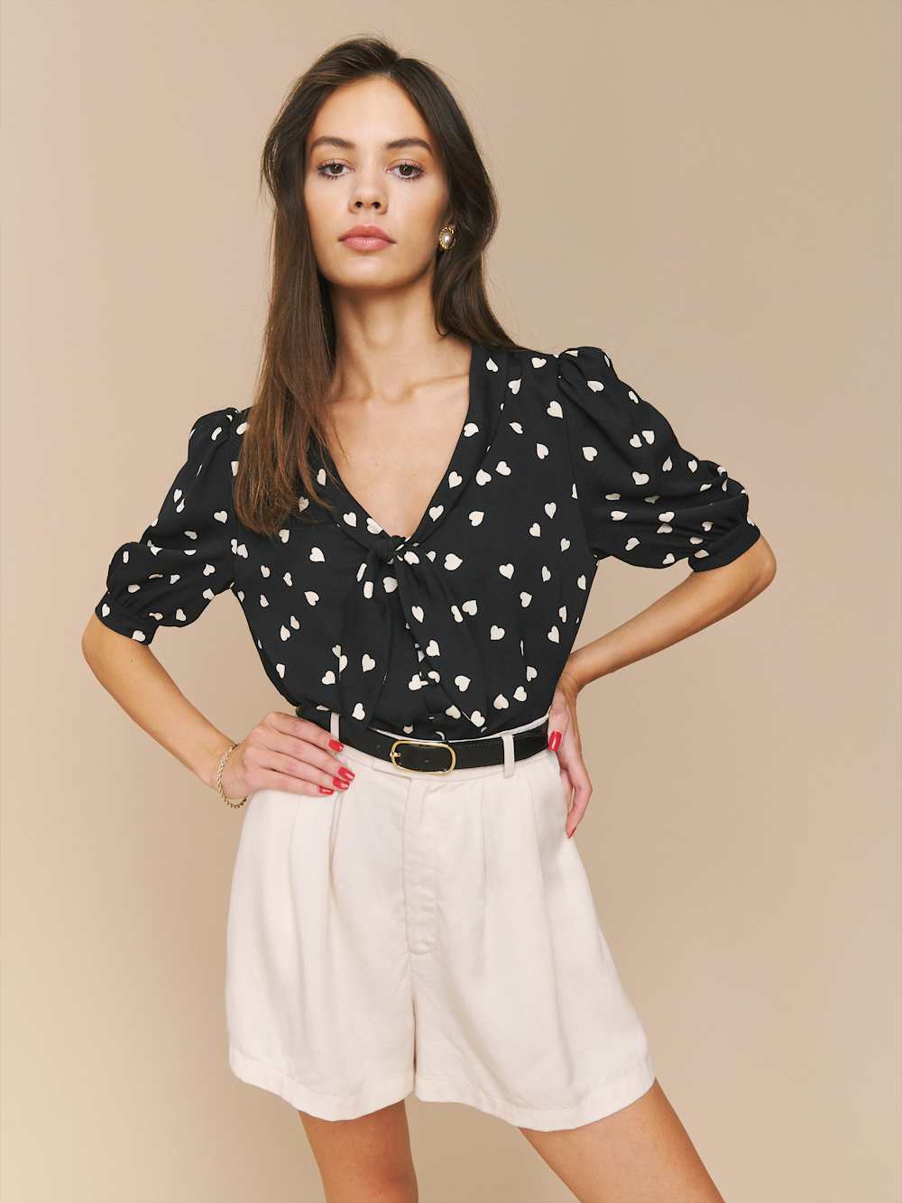 Detail oriented. Shop the Joelle Top from Reformation, a short sleeve top with puff sleeves, a V neckline, and tie detail.