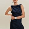 Get some compliments. Shop the Jonelle Silk Dress from Reformation, a sleeveless mini length dress with a boat neckline and open back with a cowl detail.