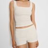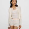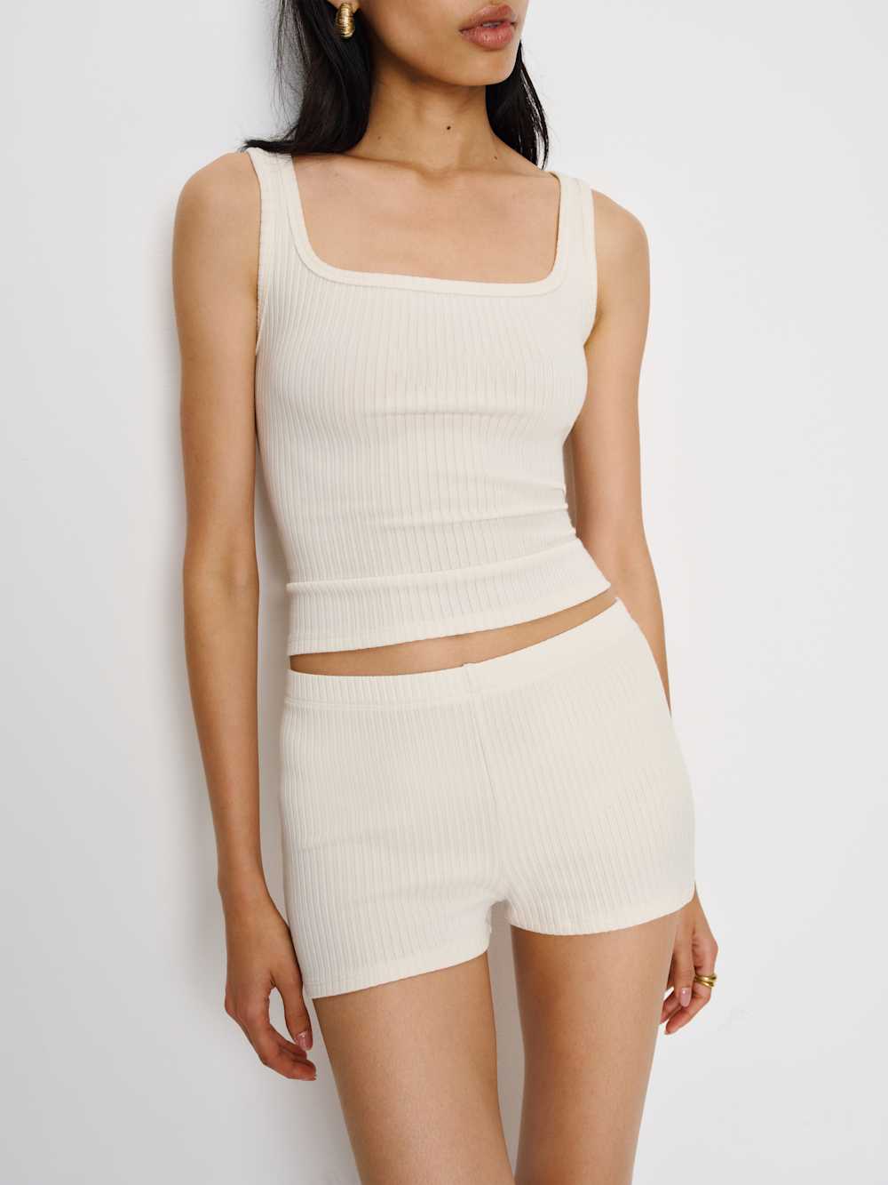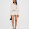 You make it look easy. Shop the Kai Knit Three Piece from Reformation, a long-sleeved cardigan, a sleeveless top with a scoop neckline, and shorts.