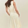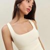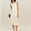 Shop the Kayla Knit Dress from Reformation, a sleeveless midi dress with a square neckline, drop waist, and ruching throughout.