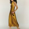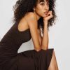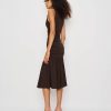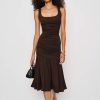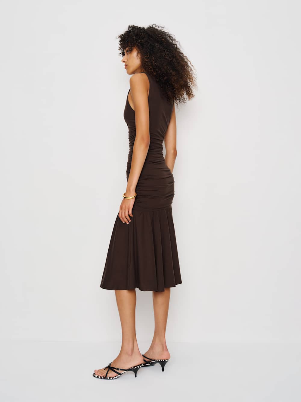 Shop the Kayla Knit Dress from Reformation, a sleeveless midi dress with a square neckline, drop waist, and ruching throughout.