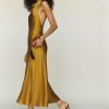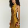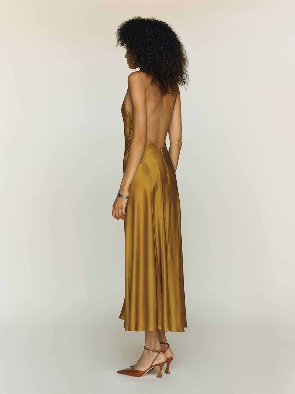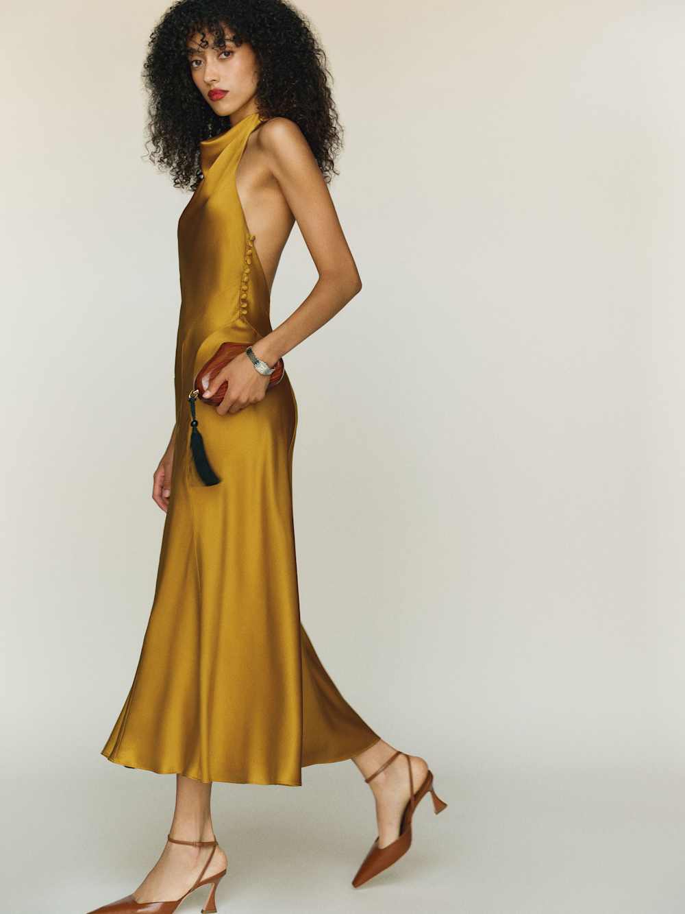 You must be new. Shop the Kaylah Silk Dress from Reformation, a sleeveless maxi dress a high neck and low open back.