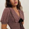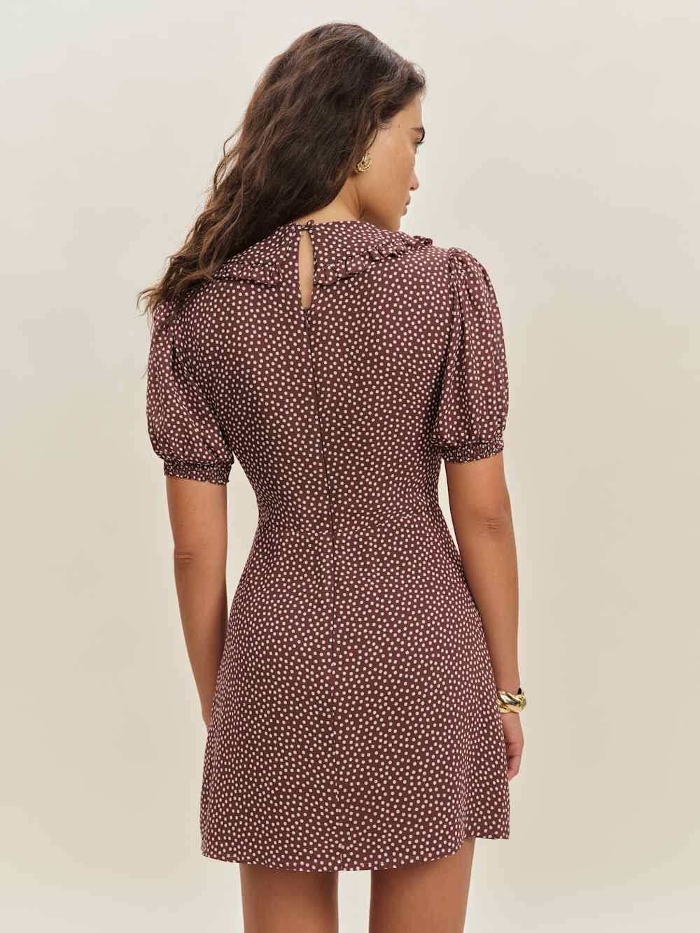 Get some compliments. Shop the Kaylia Dress from Reformation, a mini dress with a v-neckline, puff sleeves, oversized collar, and ties at the front.