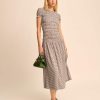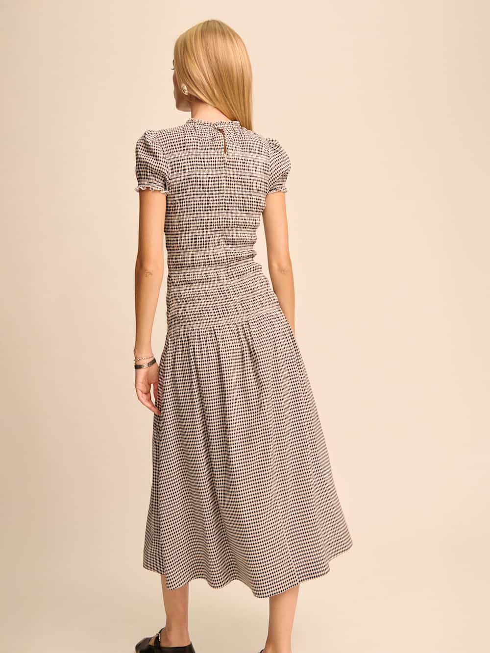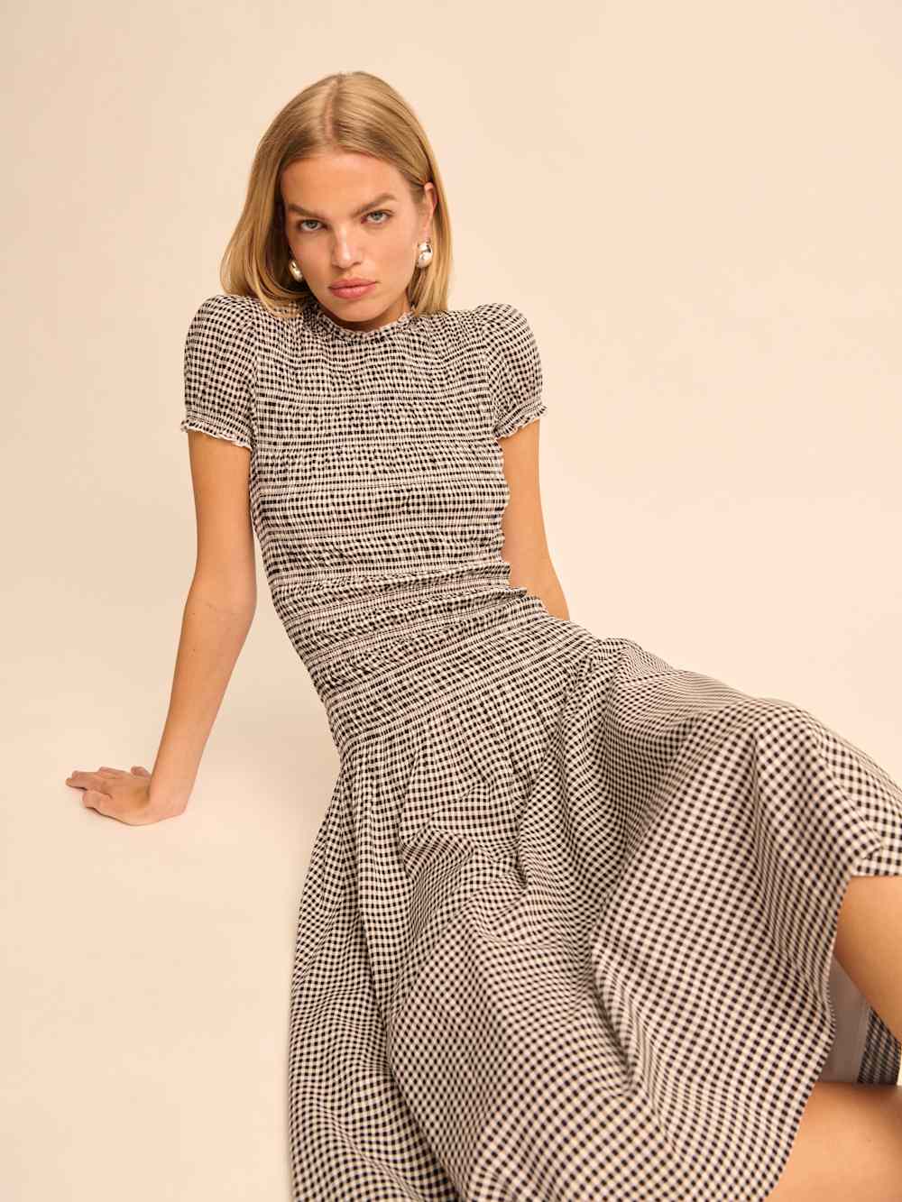 Wear the dress. Shop the Kiria Dress from Reformation, a short-sleeved midi dress with a drop waist and smocked bodice.