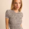 The model is wearing a size 0 and is 5’10", 24" waist, 35" hips, 31" bust.