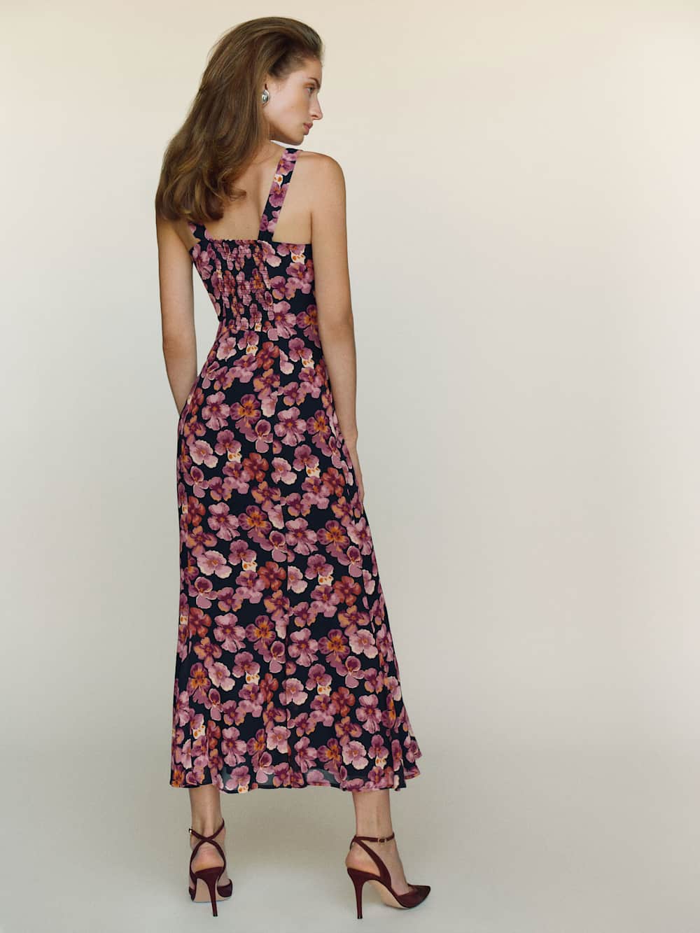 Wear the dress. Shop the Laine Dress from Reformation, a sleeveless midi dress with a sweetheart neckline, button detailing at the bust, and a mermaid fit.