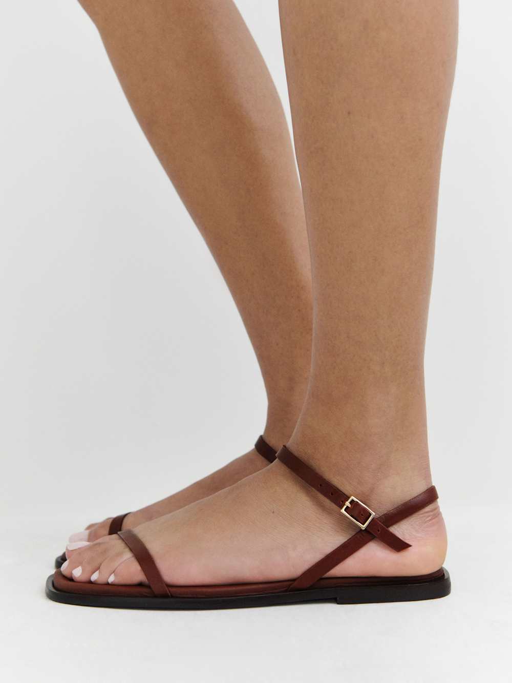 Wear me. Shop the Lake Flat Sandal from Reformation, a flat sandal with a single strap at the toe and and andjustable ankle strap.