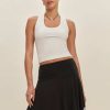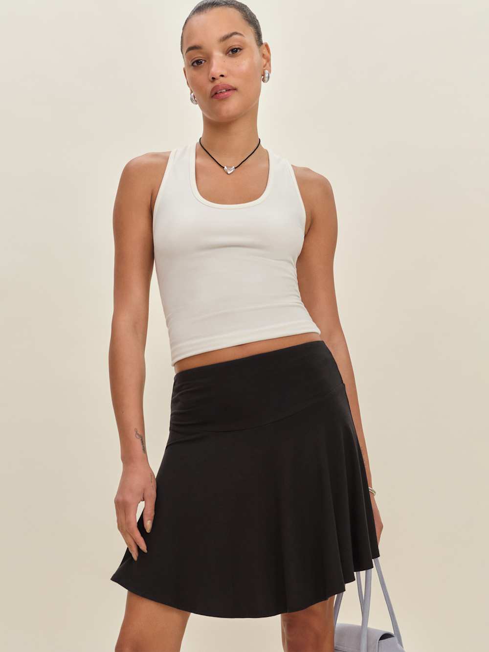 Throw it on when you’re running kind of late. Shop the Laurie Knit Skirt from Reformation, a mini skirt with a fitted waist and an A-line hem.