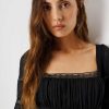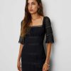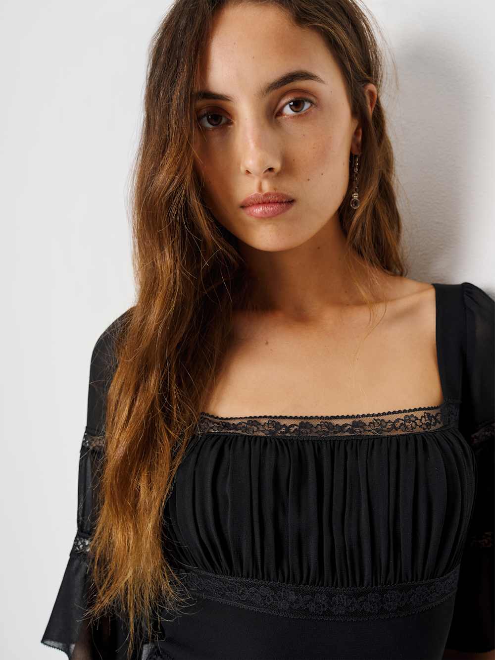 You flirt. Shop the Laverna Dress from Reformation, a short-sleeved midi dress with a square neckline, bell sleeves, and lace detailing throughout.