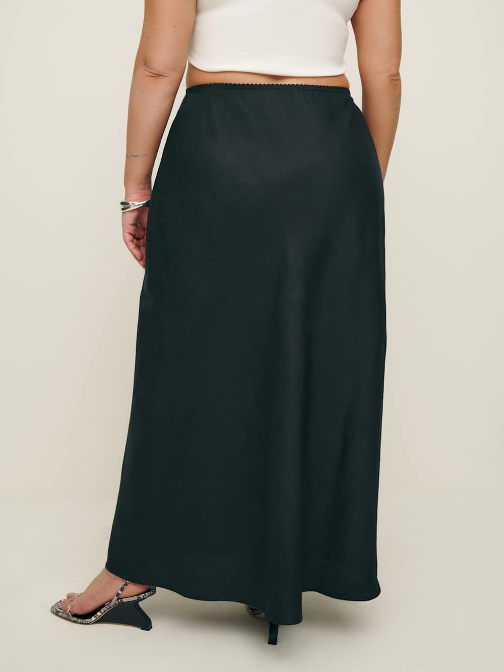 Let your skirt do the talking. Shop the Layla Linen Skirt ES from Reformation, a bias cut, midi skirt with an elasticated waist.