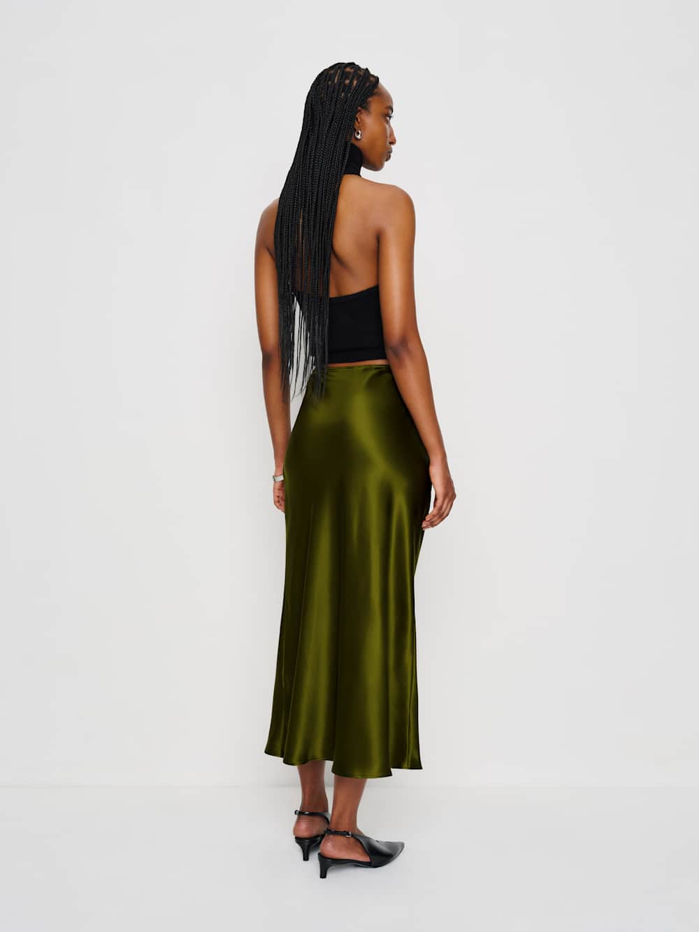 Let your skirt do the talking. Shop the Layla Silk Skirt from Reformation, a bias cut, midi skirt with an elasticated waist.