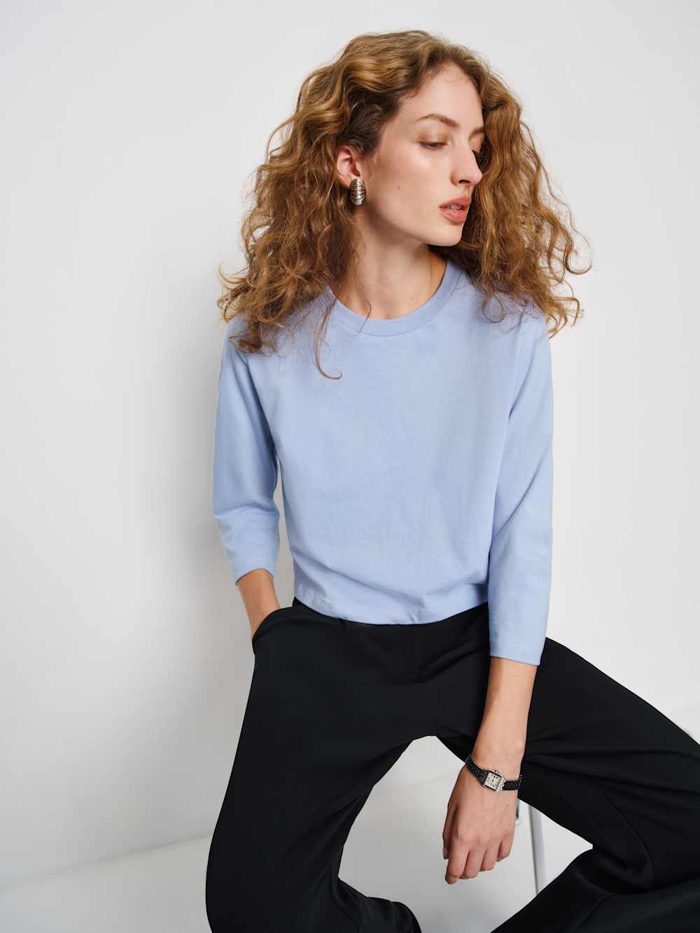 Up top. Shop the Lewis Tee from Reformation, a tee with 3/4 length sleeves, a crew neckline, and boxy fit.