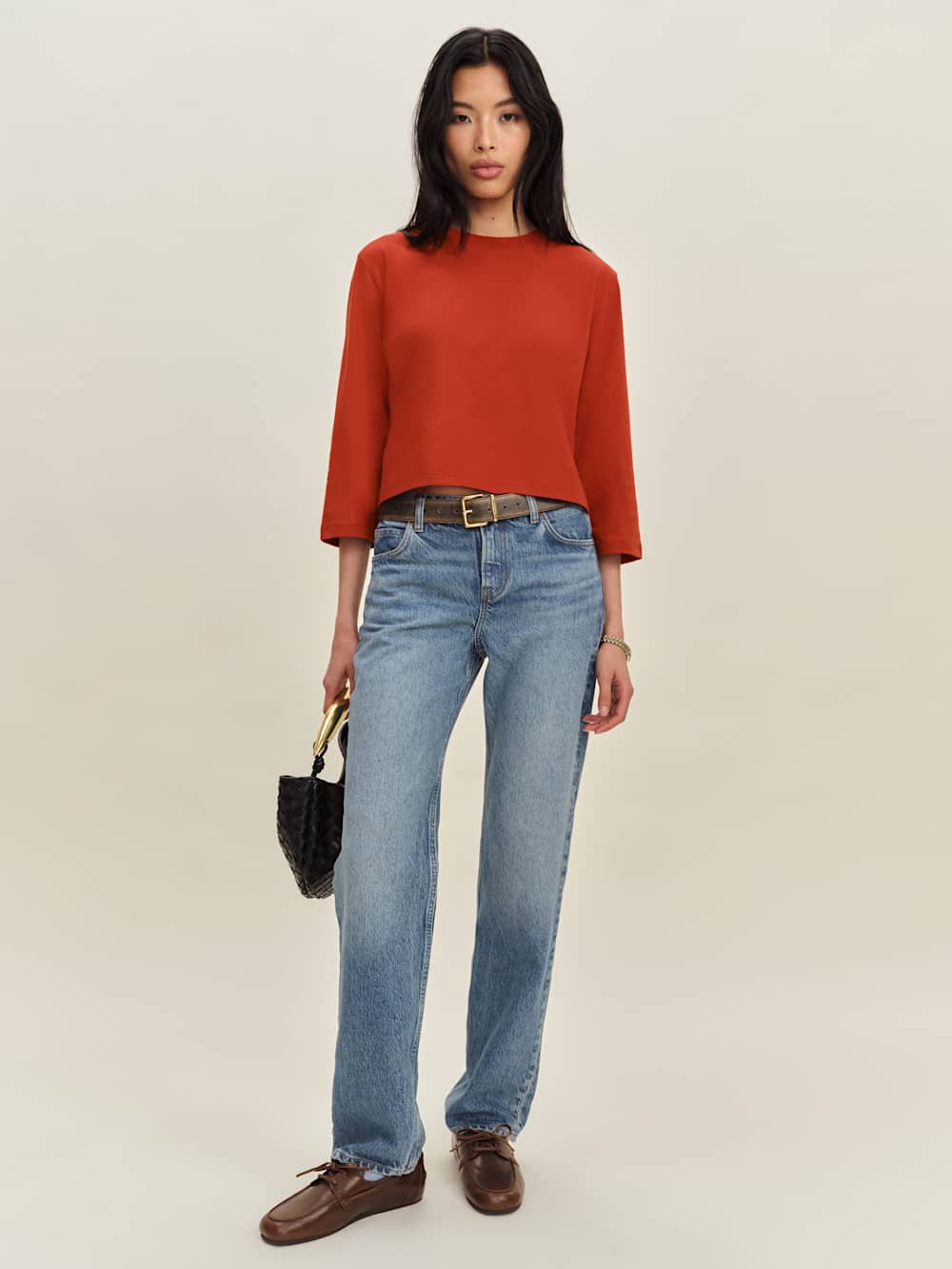 Up top. Shop the Lewis Tee from Reformation, a tee with 3/4 length sleeves, a crew neckline, and boxy fit.