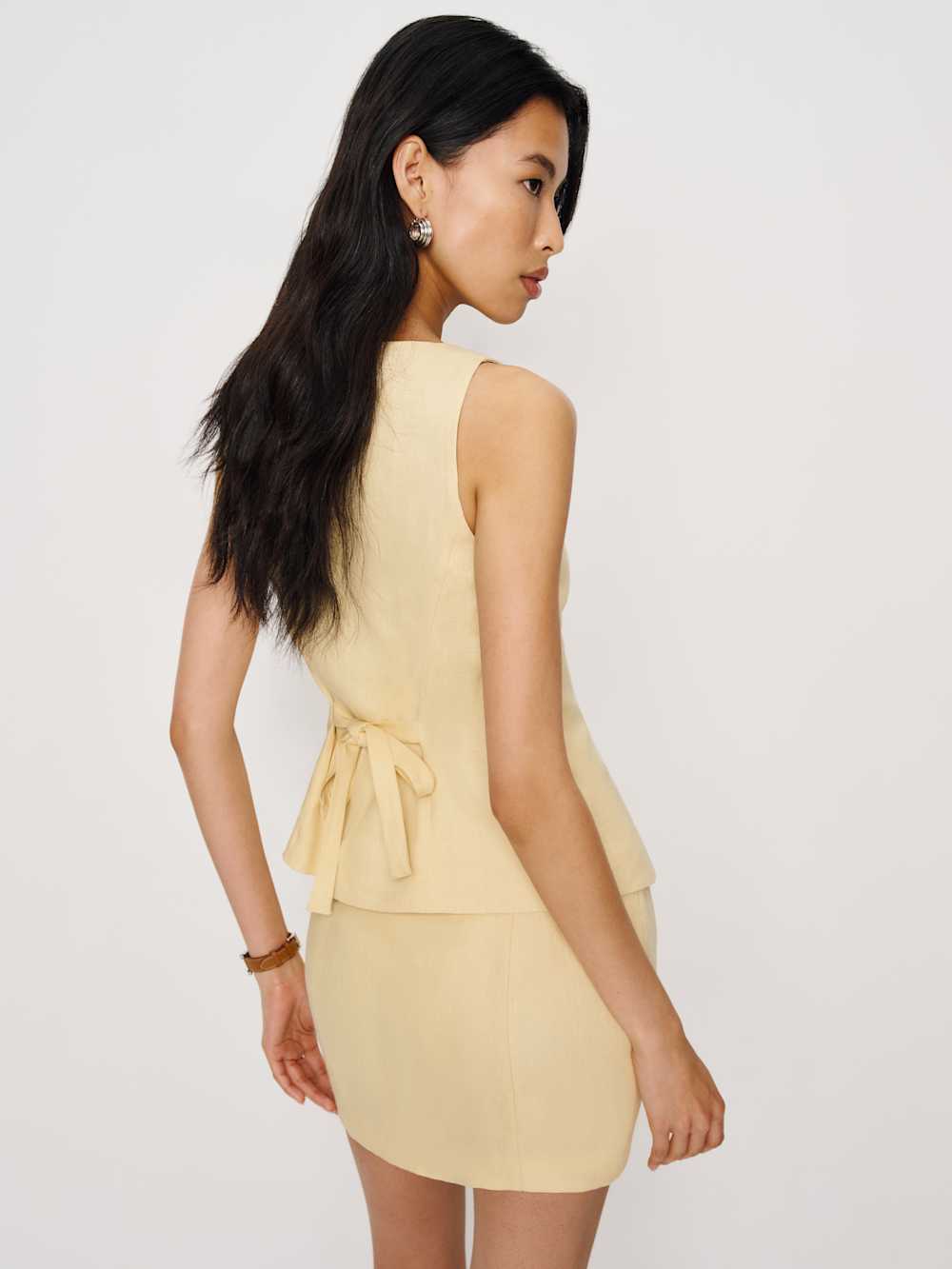 Who, me. Shop the Lina Linen Two Piece from Reformation, a two-piece set with a button-down top with an adjustable tie in the back and a mini skirt.