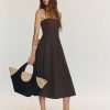 No nonsense. Shop the Lora Knit Dress from Reformation, a strapless midi dress with a straight neckline and an A-line skirt.