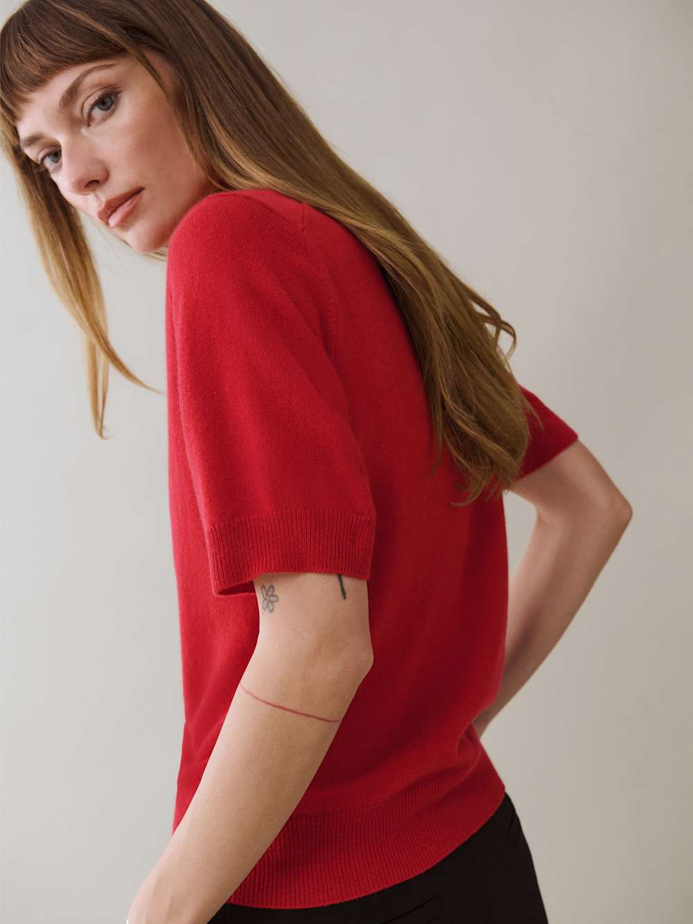 This is a fine-gauge recycled cashmere blend sweater knit – 95% Recycled Cashmere, 5% Cashmere. Hand wash + dry flat.
