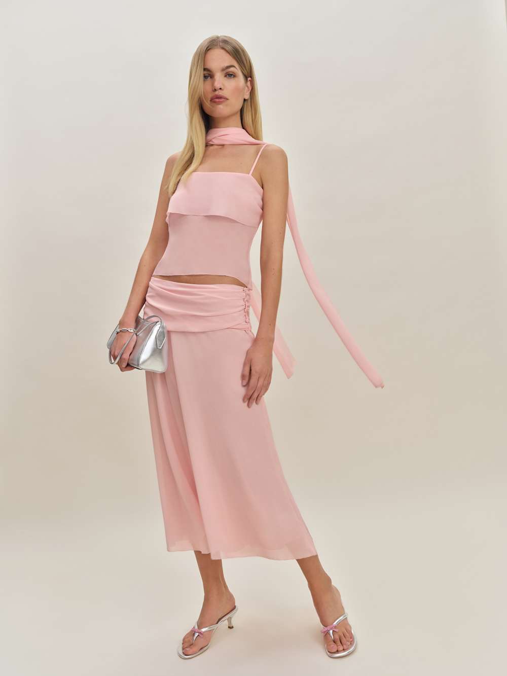The model is wearing a size 0 and is 5’10", 24" waist, 35" hips, 31" bust.