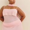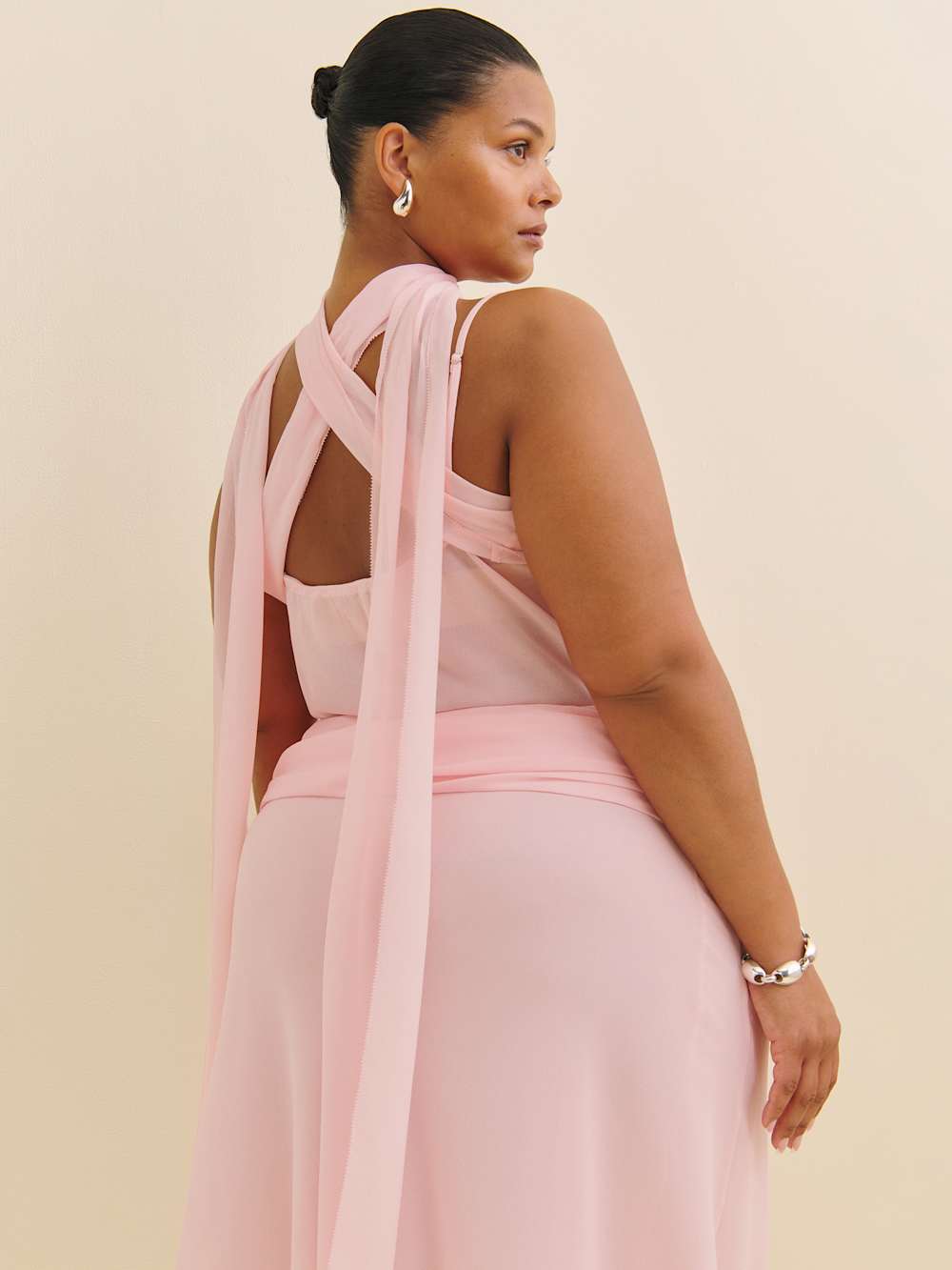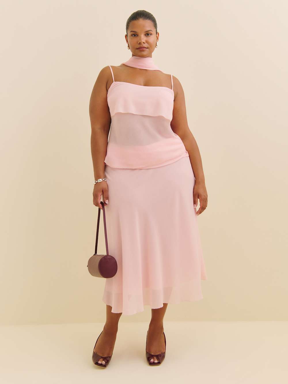 The model is wearing a size 14 and is 5’8", 33" waist, 50" hips, 42" bust.