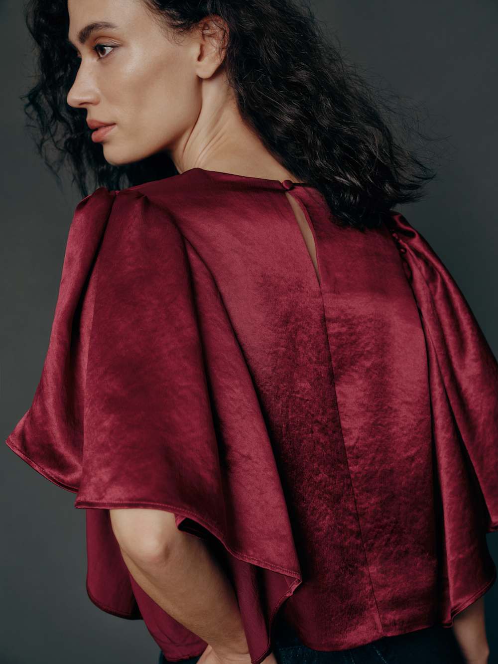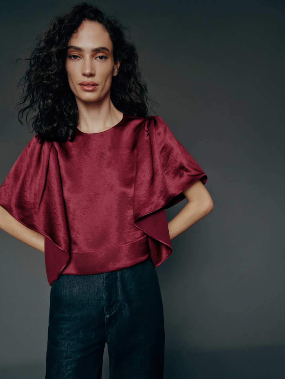 Up top. Shop the Maddox Top from Reformation, a short-sleeve top with a crew neckline and oversized flutter sleeves.