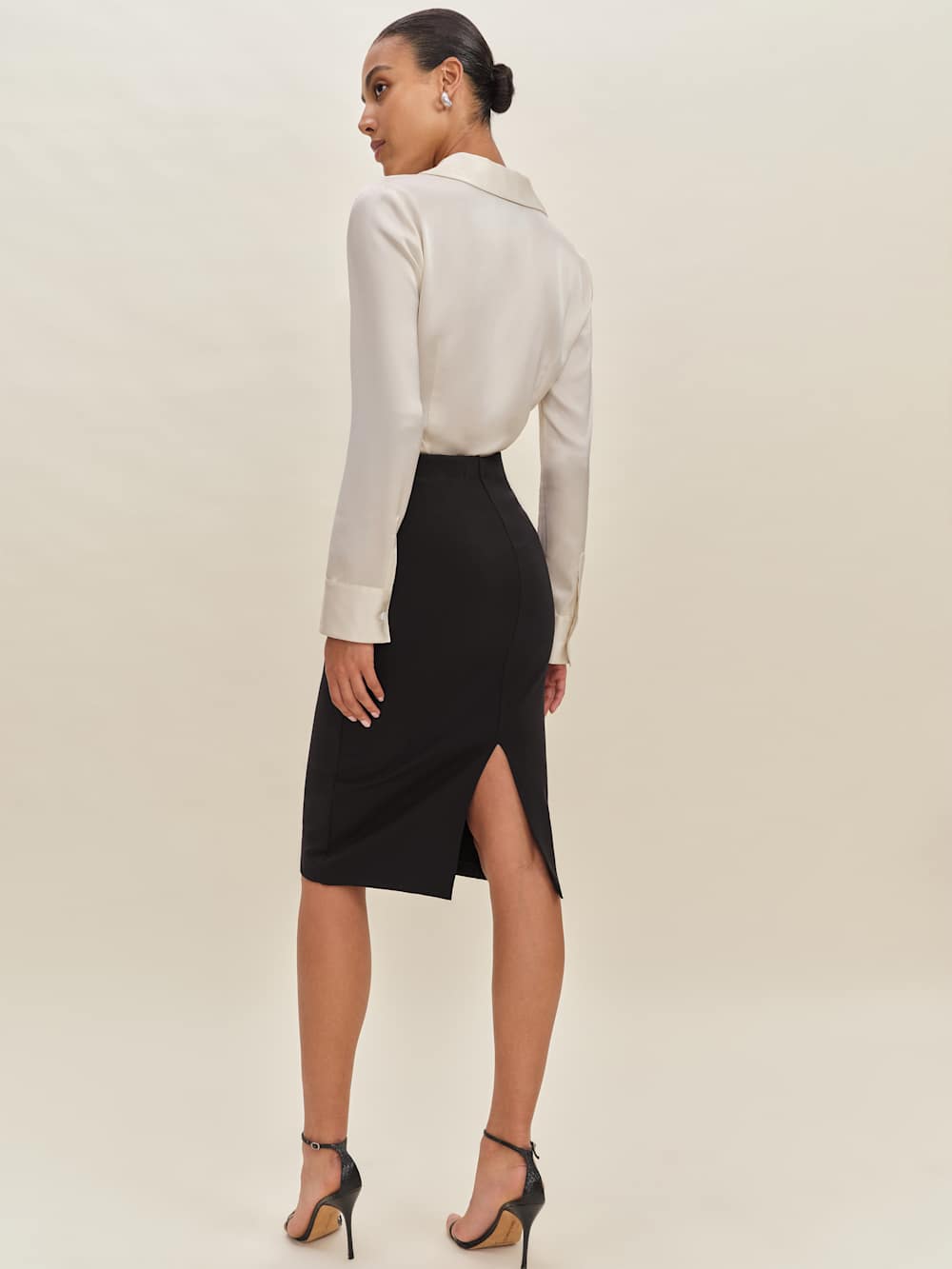 Wear the skirt. Shop the Maison Knit Skirt from Reformation, a mid-rise midi skirt with a back slit.