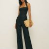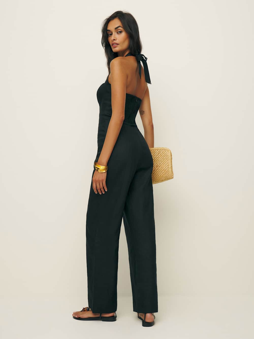 One and done. Shop the Malika Linen Jumpsuit from Reformation, a full-length jumpsuit with a square-neck halter and smocked back.