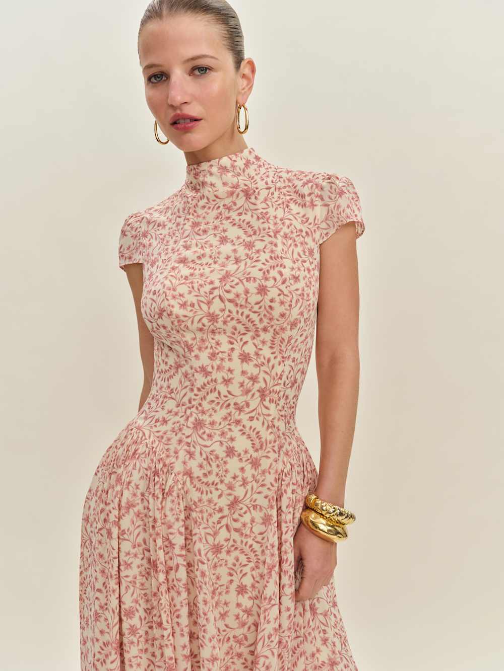 Romance for one. Shop the Maven Dress from Reformation, a cap sleeve maxi dress with a mock neckline, drop waist, and pleating at the skirt.