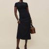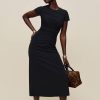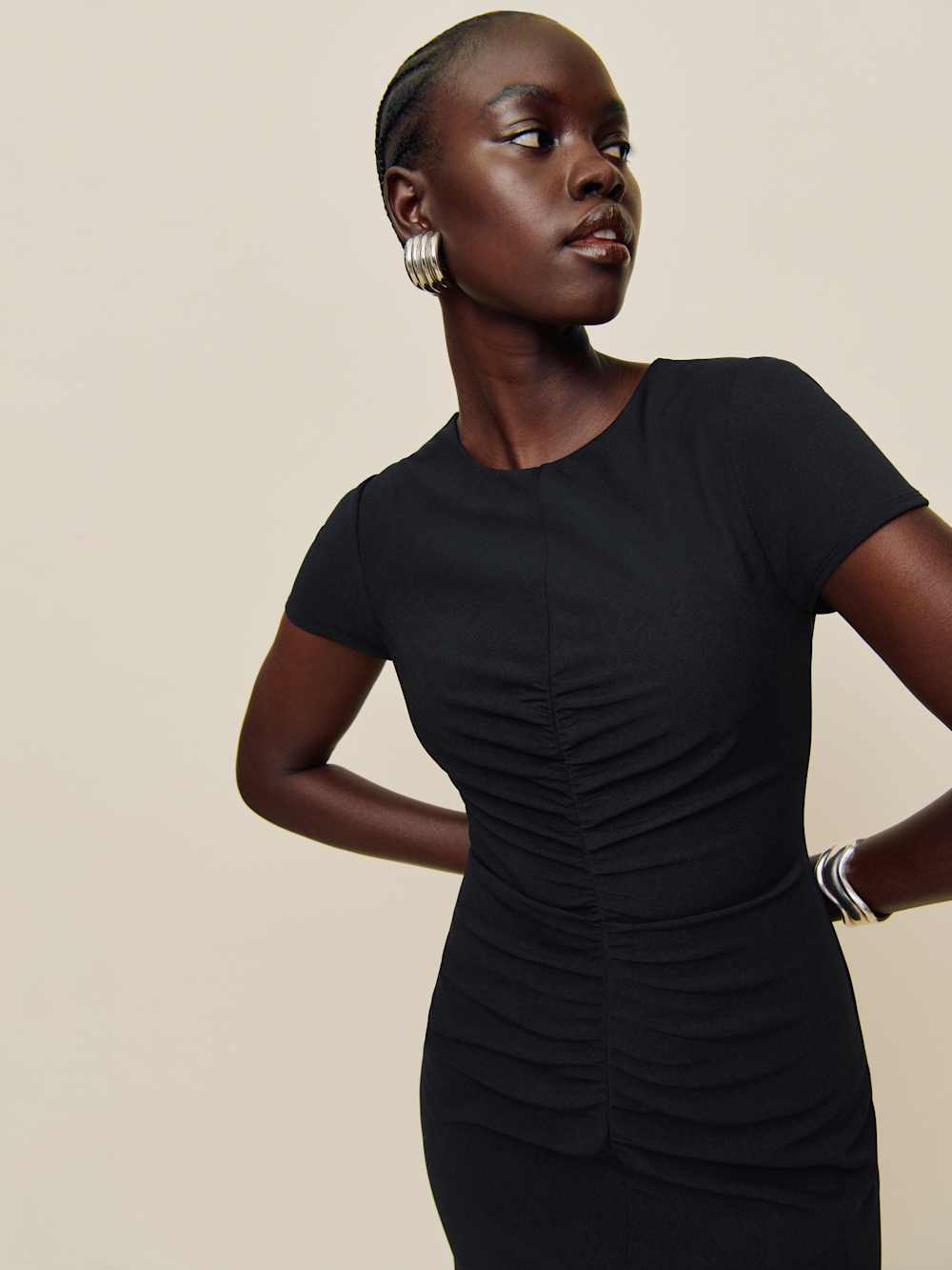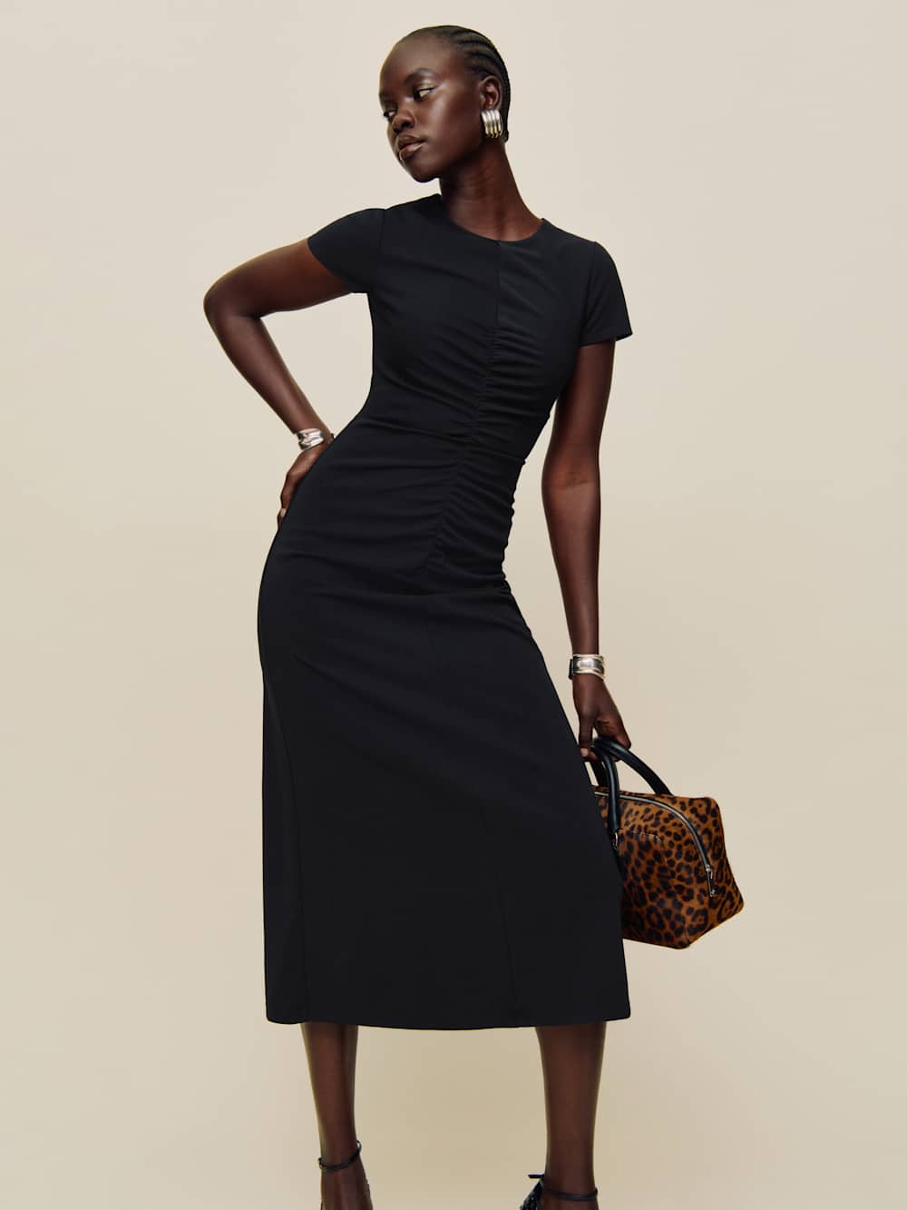 Wear the dress. Shop the Mila Knit Dress from Reformation, a short-sleeved midi dress with ruching throughout.