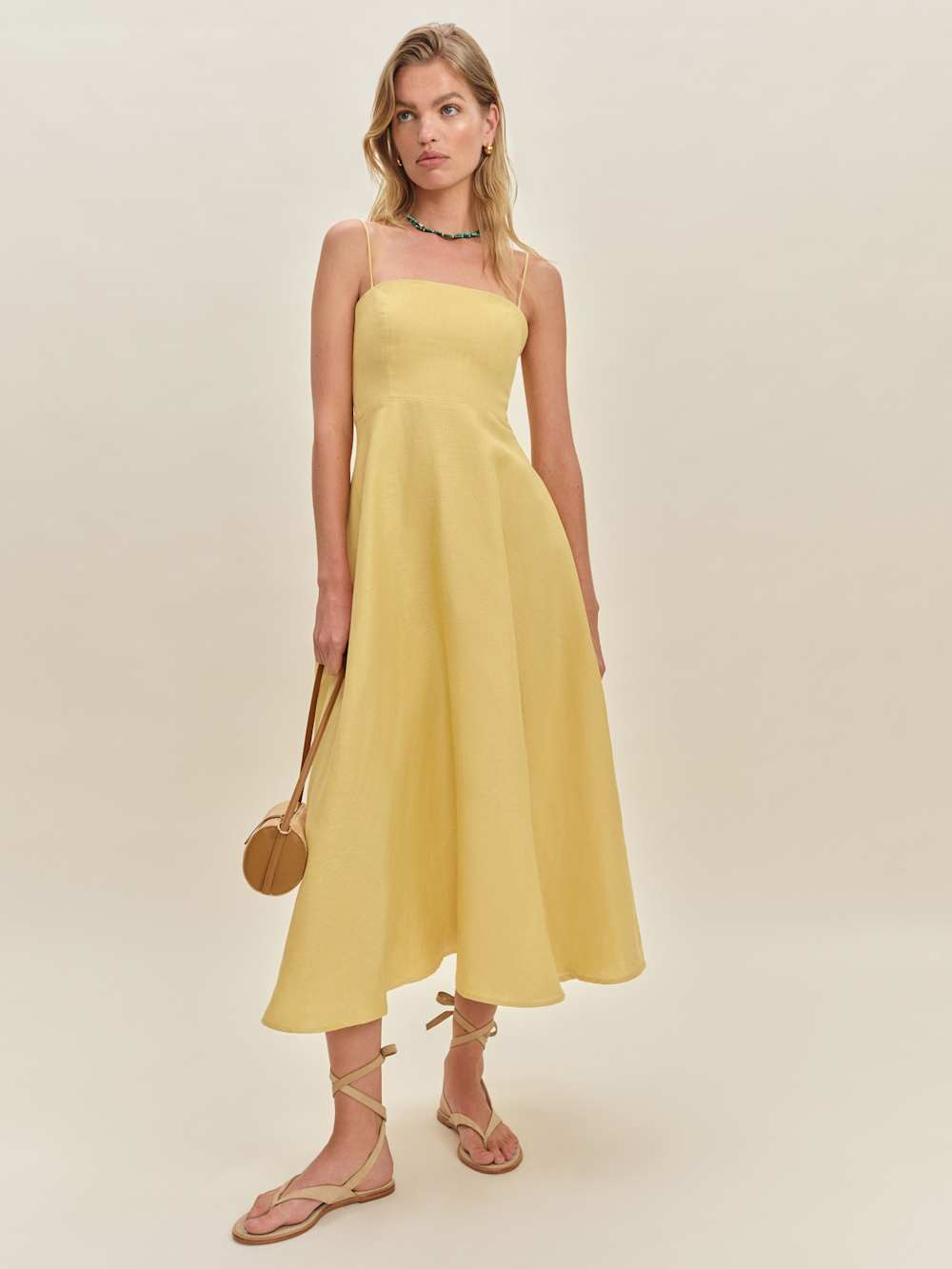 Try not to play favorites. Shop the Monette Linen Dress from Reformation, a sleeveless midi length dress with a square neckline.