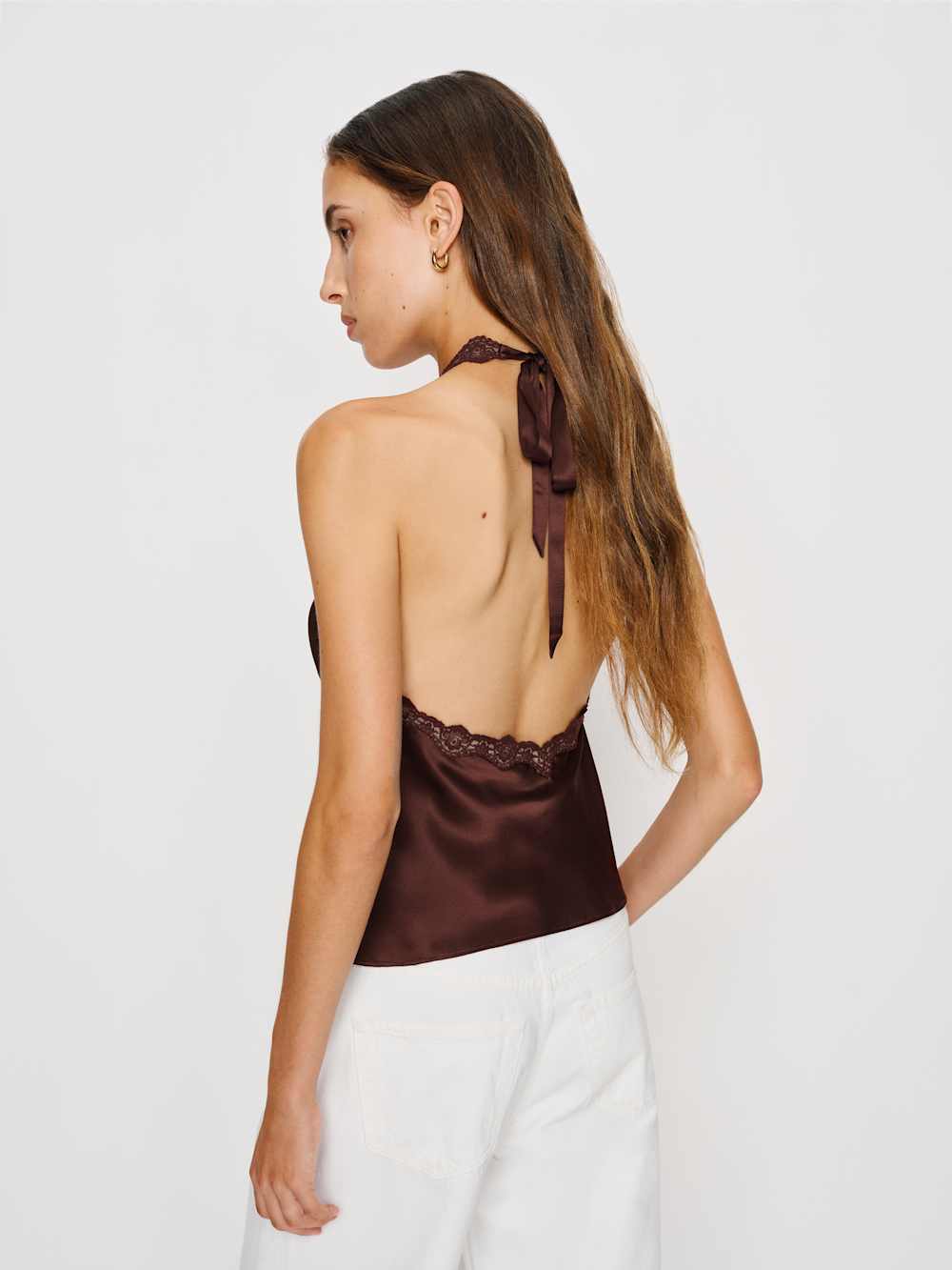If you have to be fancy soon. Shop the Monica SIlk Top from Reformation, a full length top with a tie halter neck and an open back.