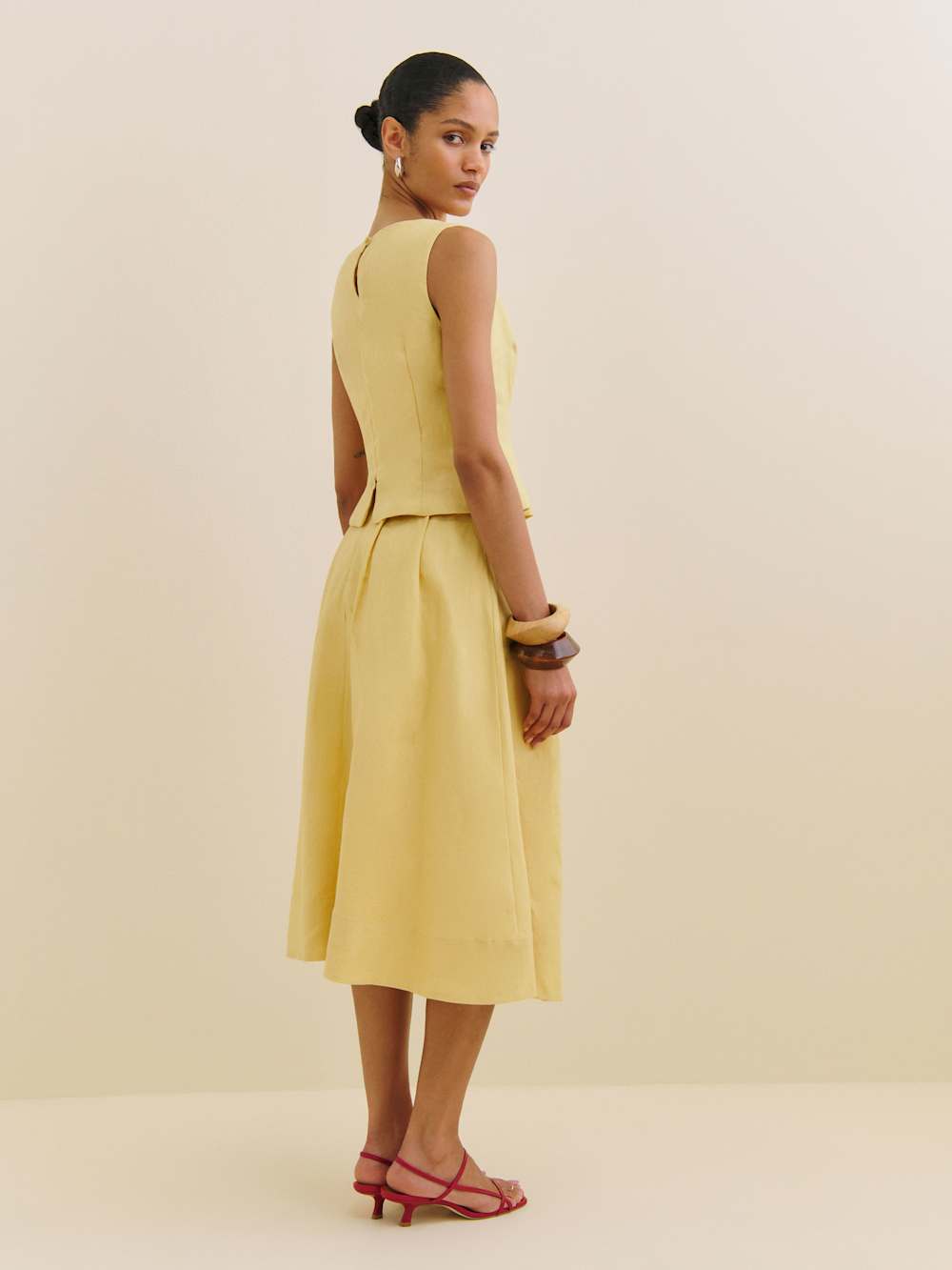 No nonsense. Shop the Moya Linen Two Piece from Reformation, a sleeveless top with a high neckline and matching midi skirt.