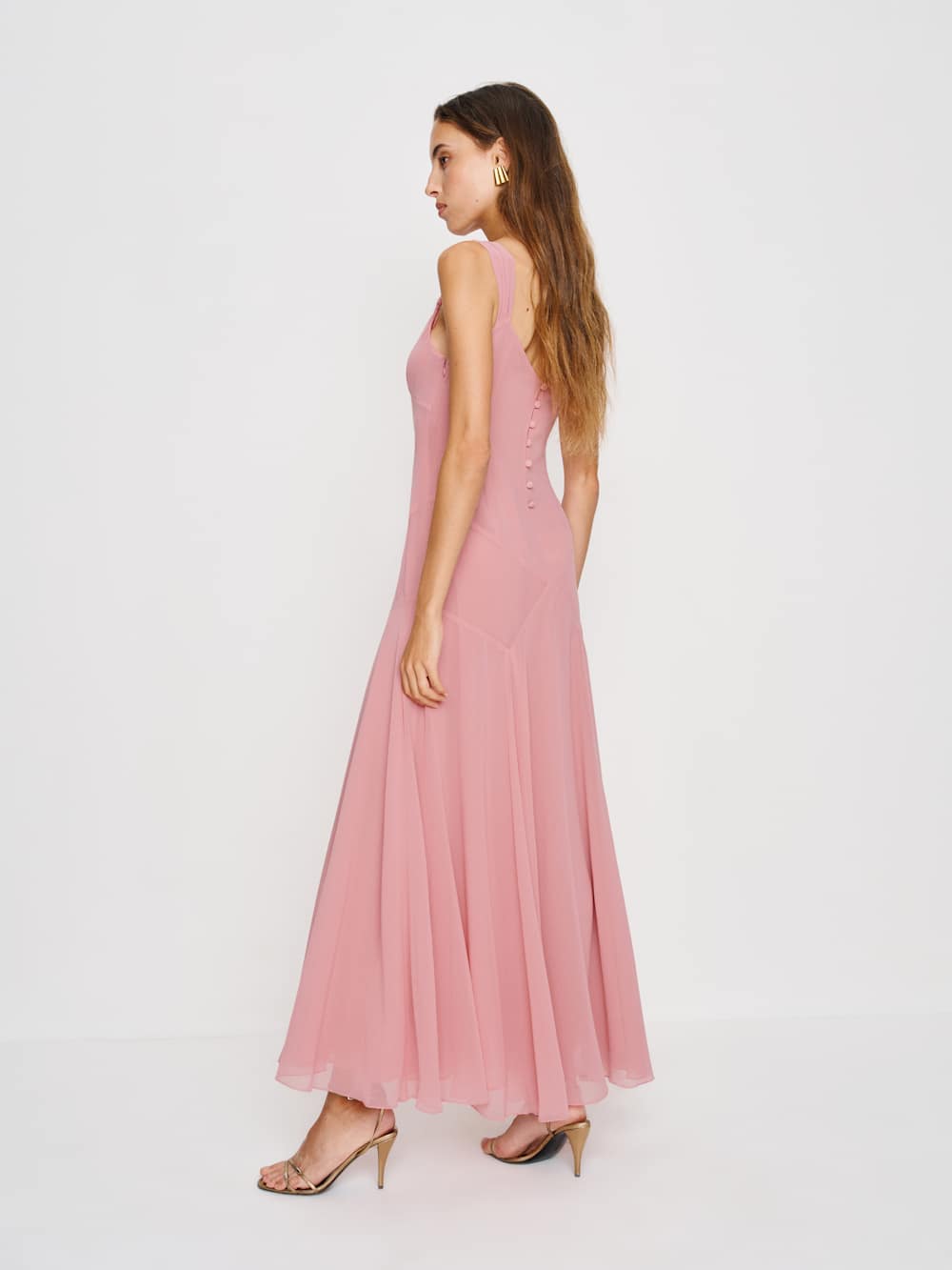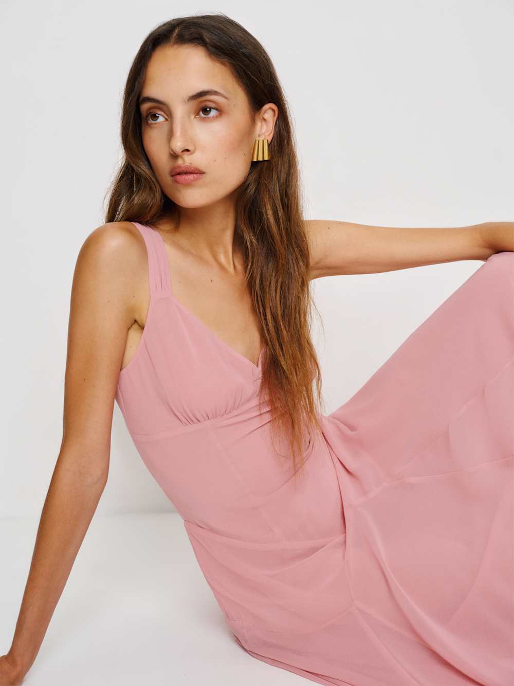 Center of attention. Shop the Narcissa Dress from Reformation, a sleeveless maxi dress with a V-neckline, bias stitching, and a slim fit.