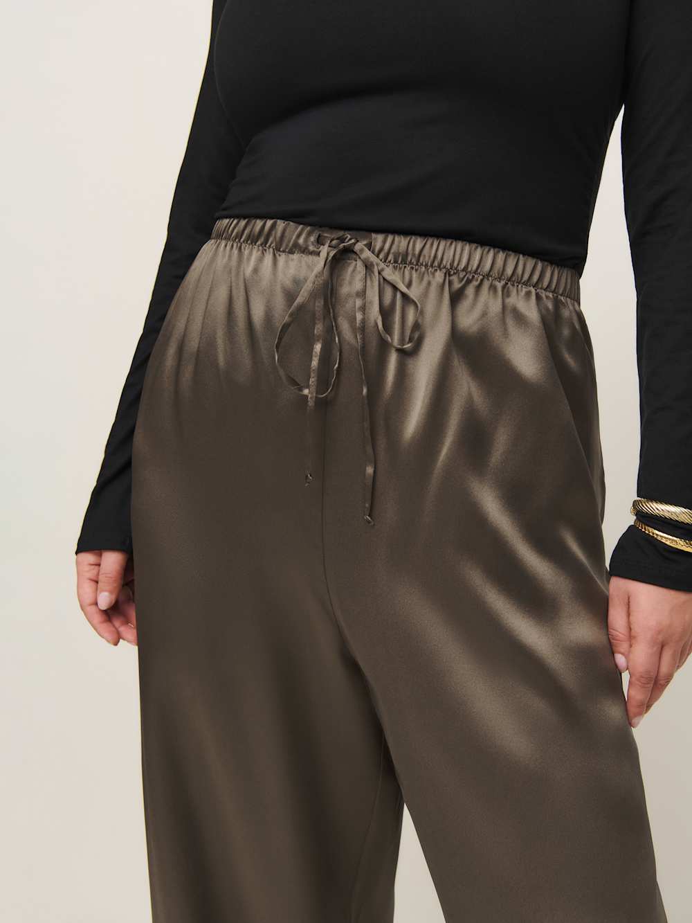 New silky. Shop the Olina Silk Pant ES from Reformation, fitted in the waist with a relaxed leg and adjustable drawstring waist.