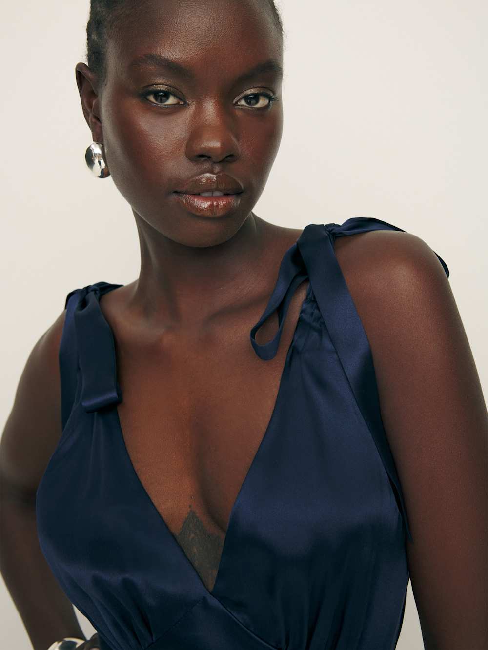 If you have to be fancy soon. Shop the Pernille Silk Dress from Reformation, a sleeveless, maxi dress with a V-neckline and adjustable shoulder ties.