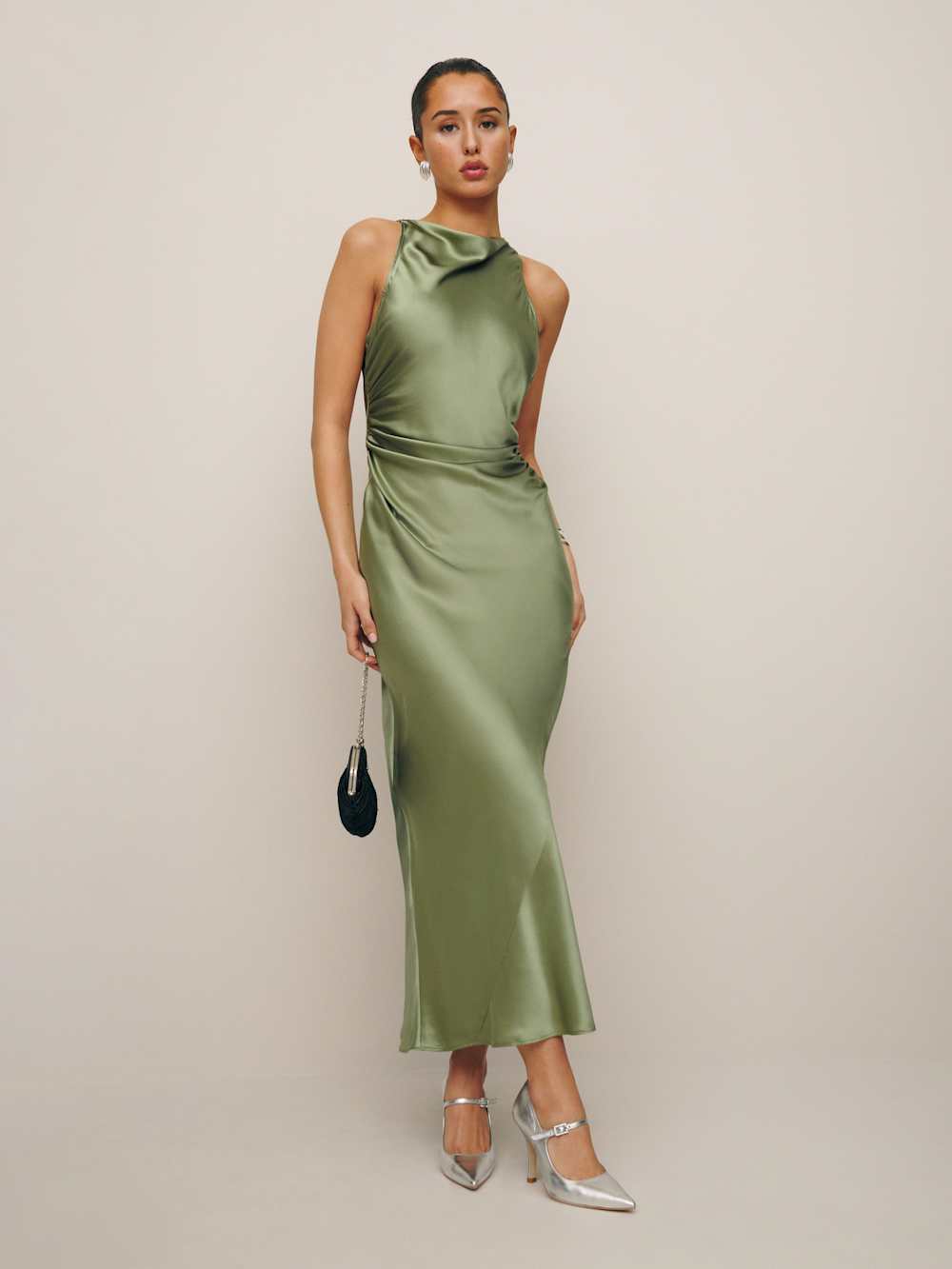 Center of attention. Shop the Petites Casette Silk Dress from Reformation, a sleeveless, midi dress with a high cowl neckline.