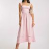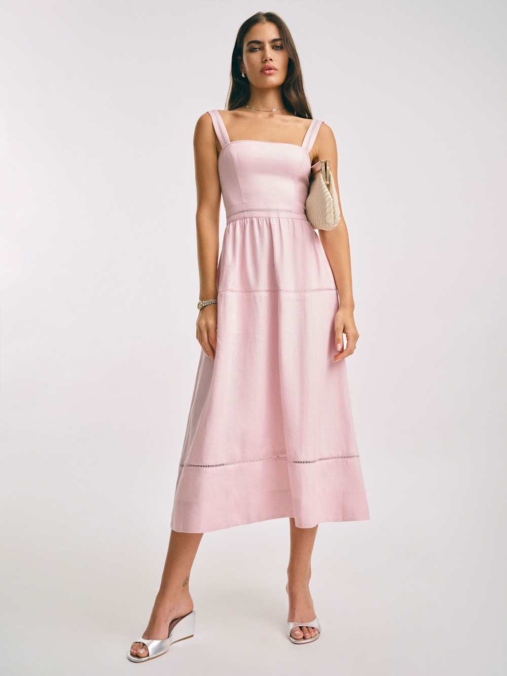 Wear me. Shop the Petites Everett Linen Dress from Reformation, a sleeveless midi dress with a square neckline and embroidered detailing.