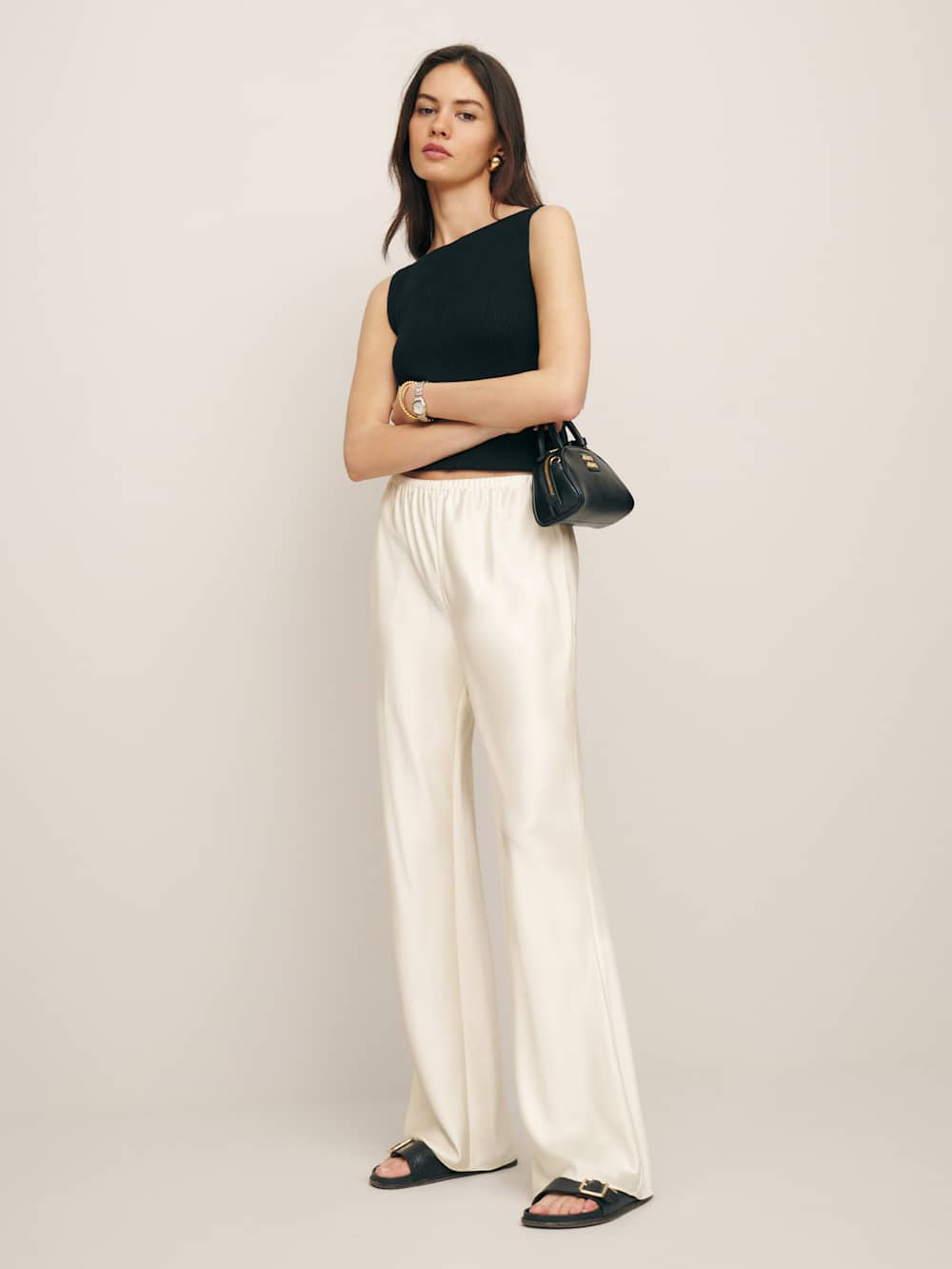 Fancy pants. Shop the Petites Gale Satin Mid Rise Bias Pant from Reformation, a mid rise bias cut pant with an elastic waistband.